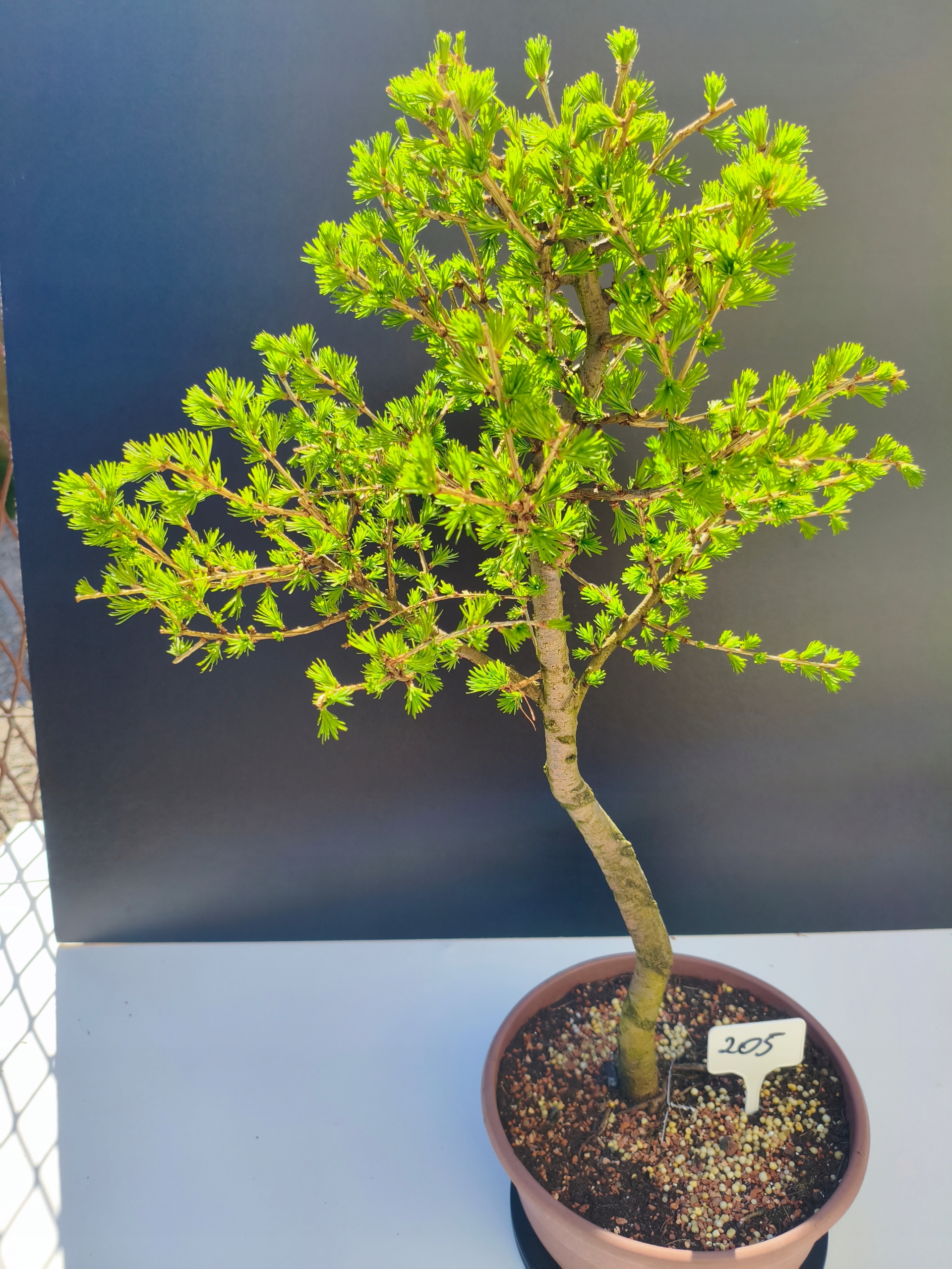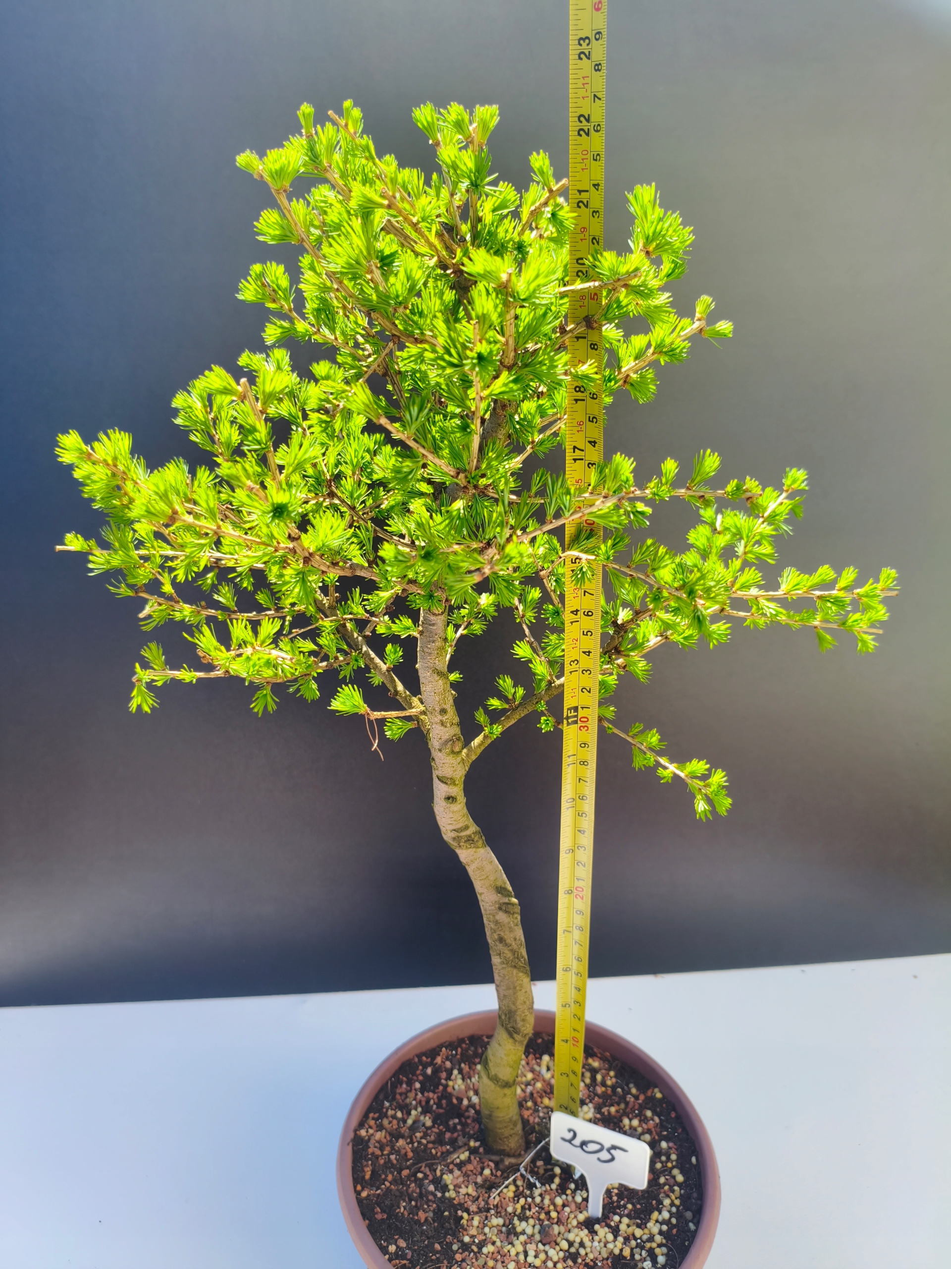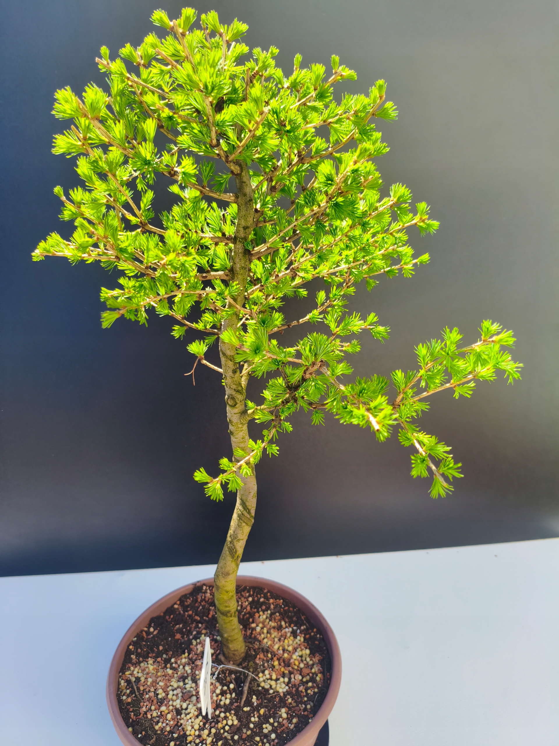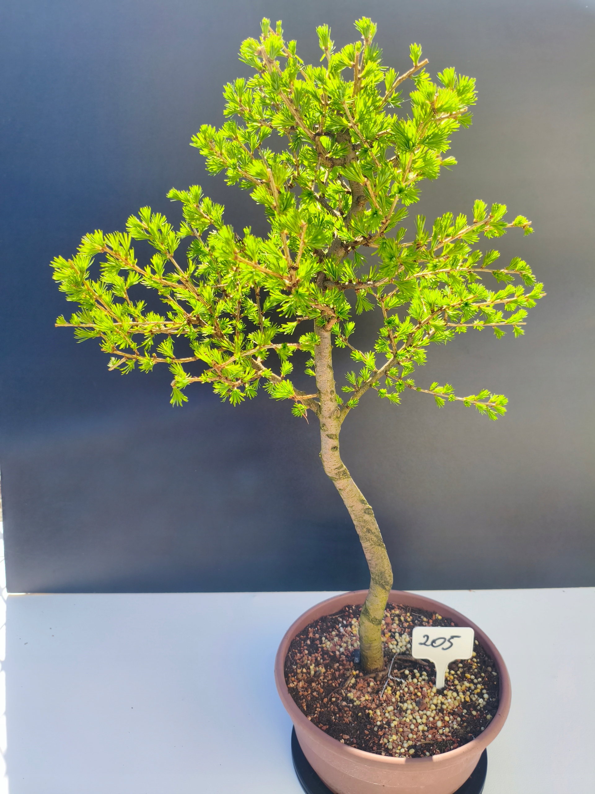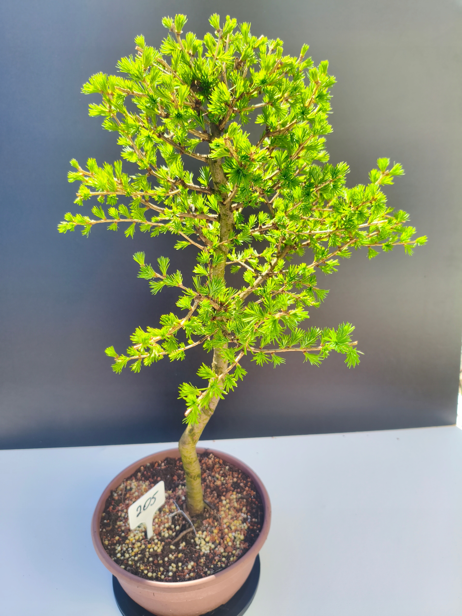 Każde nasze drzewko bonsai to unikalny egzemplarz, dlatego każde zostaje wystawione osobno, ponieważ traktujemy każde indywidualnie – od formowania po pielęgnację. Modrzewie te są w naszych rękach od 2021 roku i obecnie mają już 11 lat, dzięki czemu prezentują się wyjątkowo dojrzale i stabilnie.