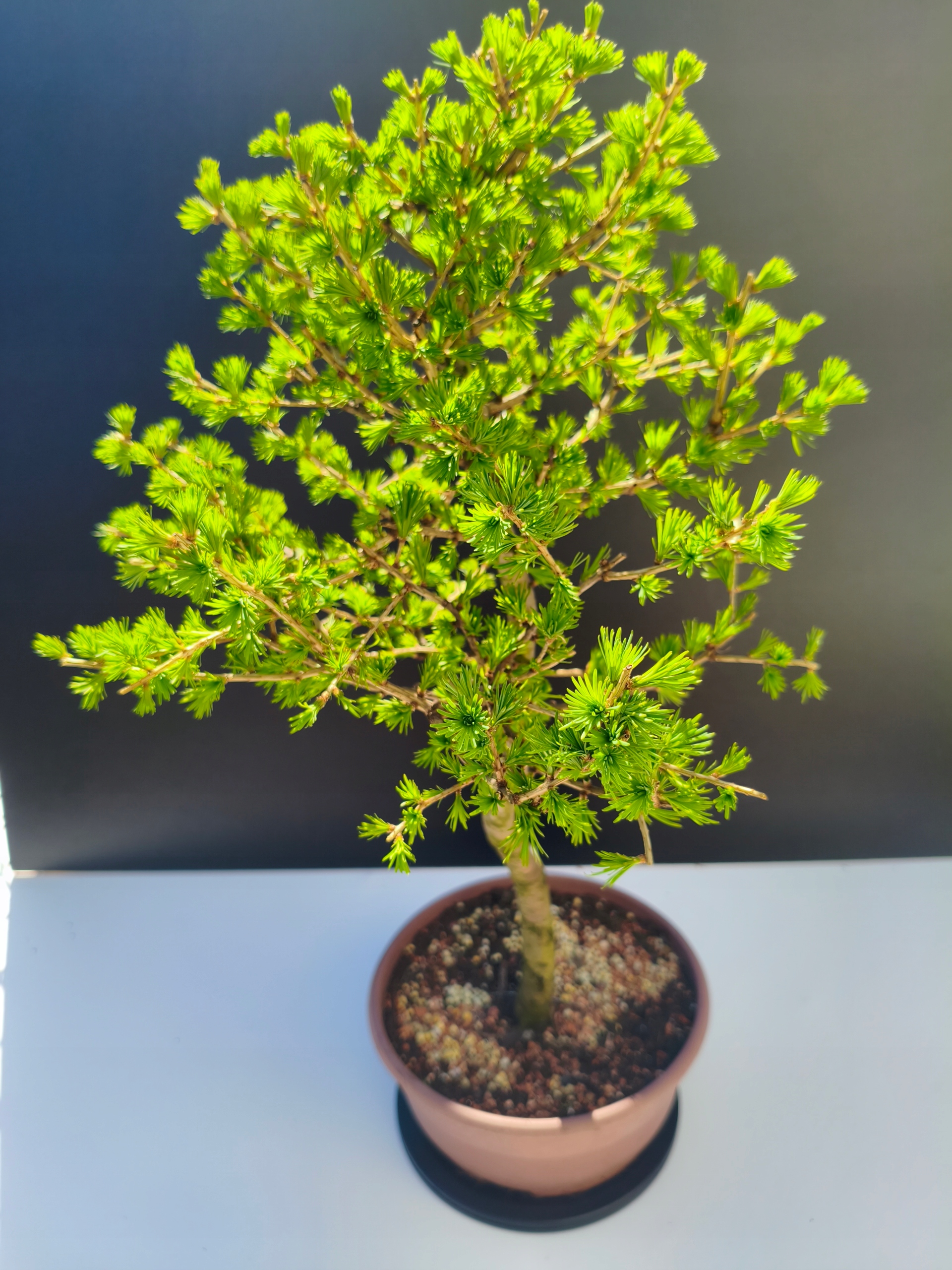 Naturalny rytm – piękno zmienności Modrzew europejski to wyjątkowe bonsai, które jesienią naturalnie zrzuca igły, aby na wiosnę wypuścić nowe, soczyście zielone przyrosty. To jedno z nielicznych drzewek iglastych z tak wyraźnym sezonowym cyklem – co czyni je jeszcze bardziej fascynującym.