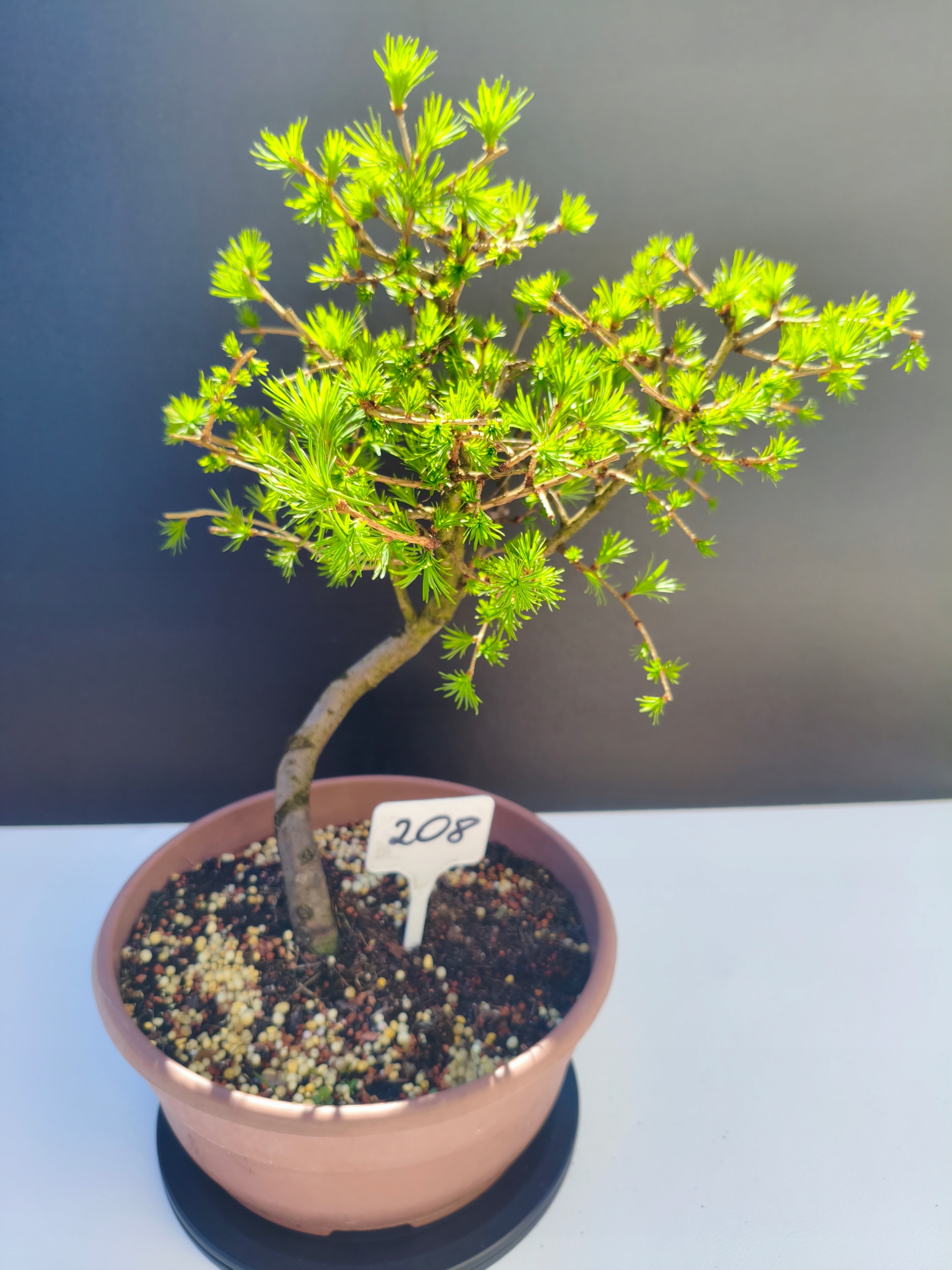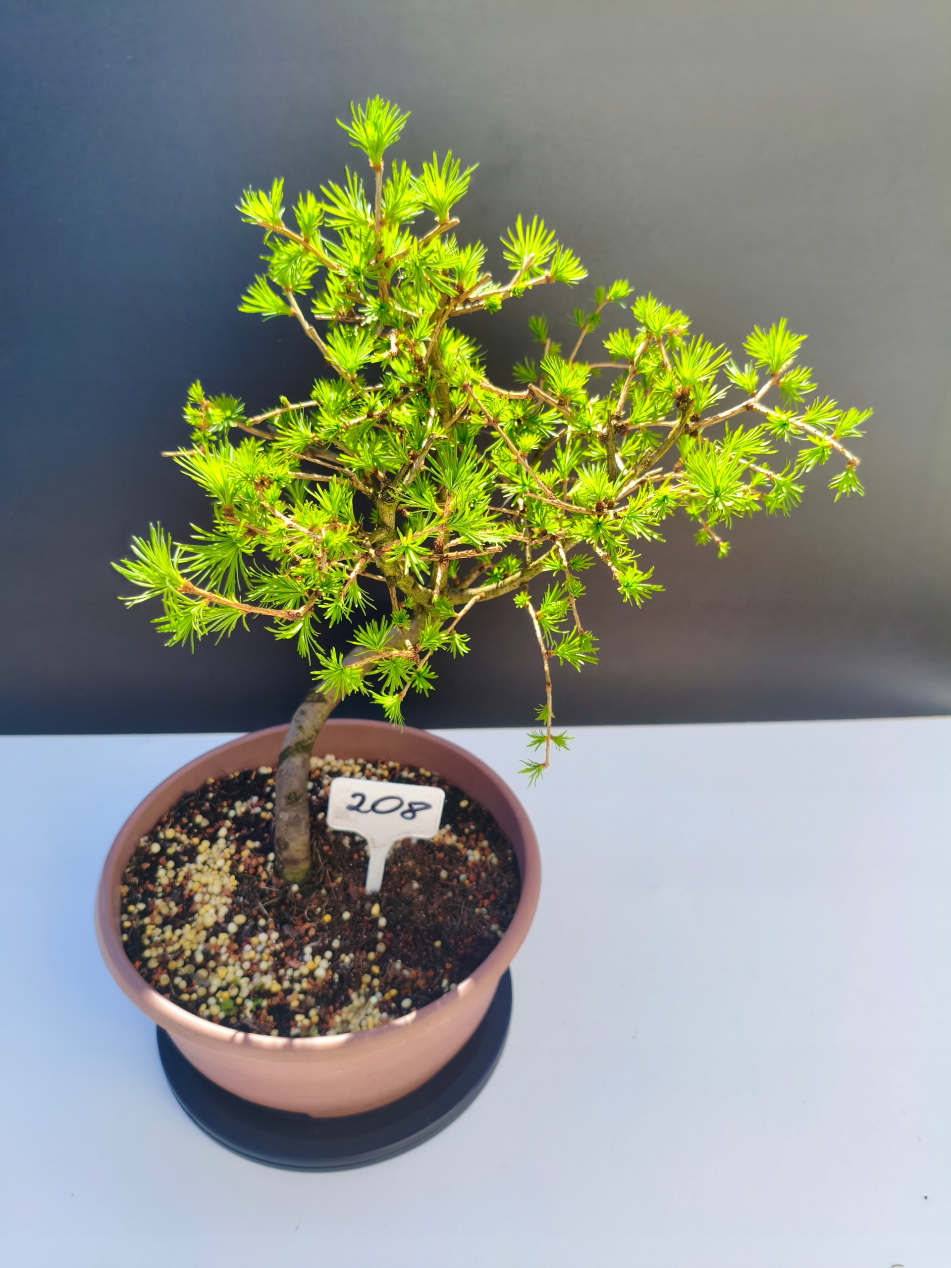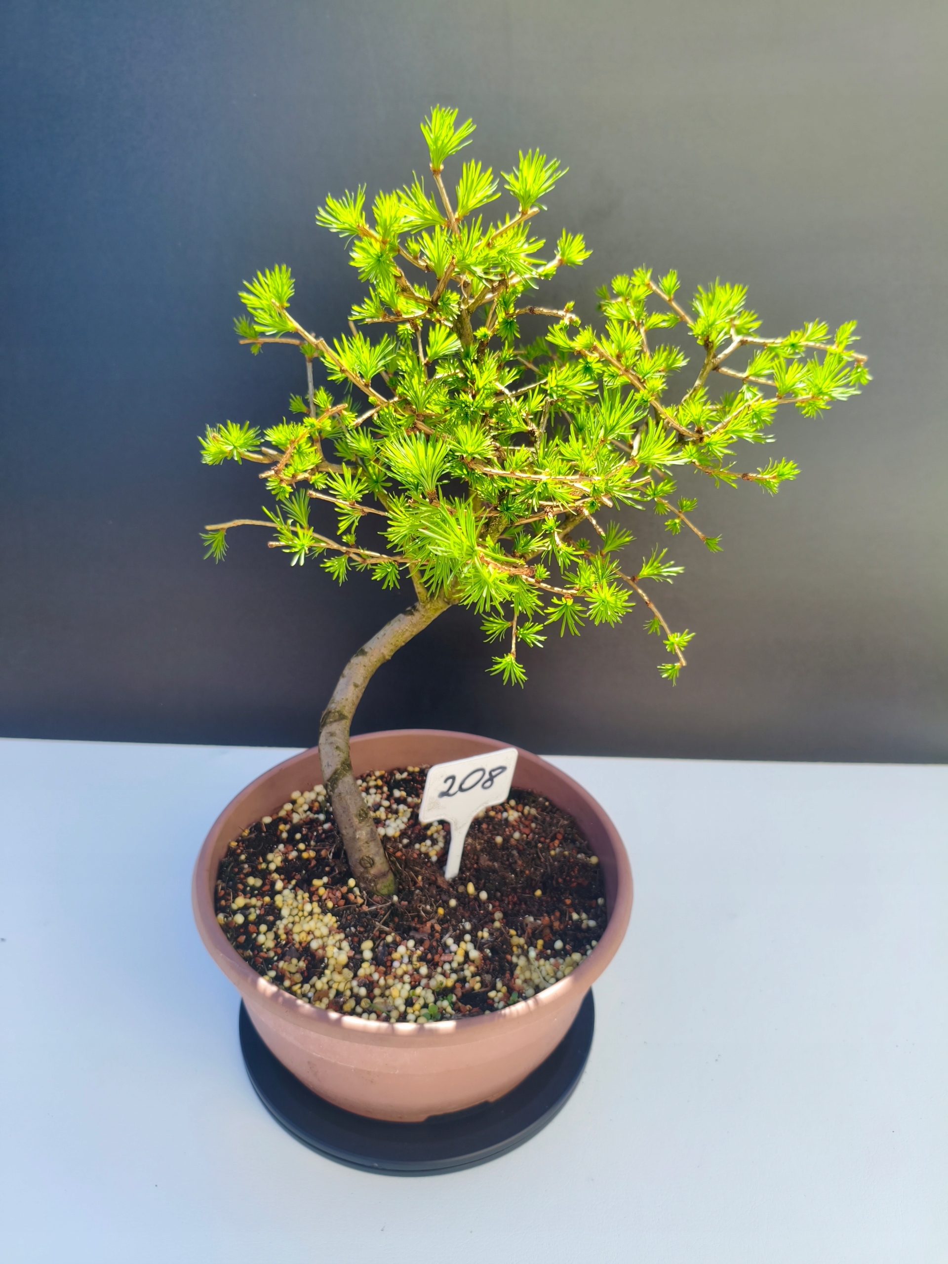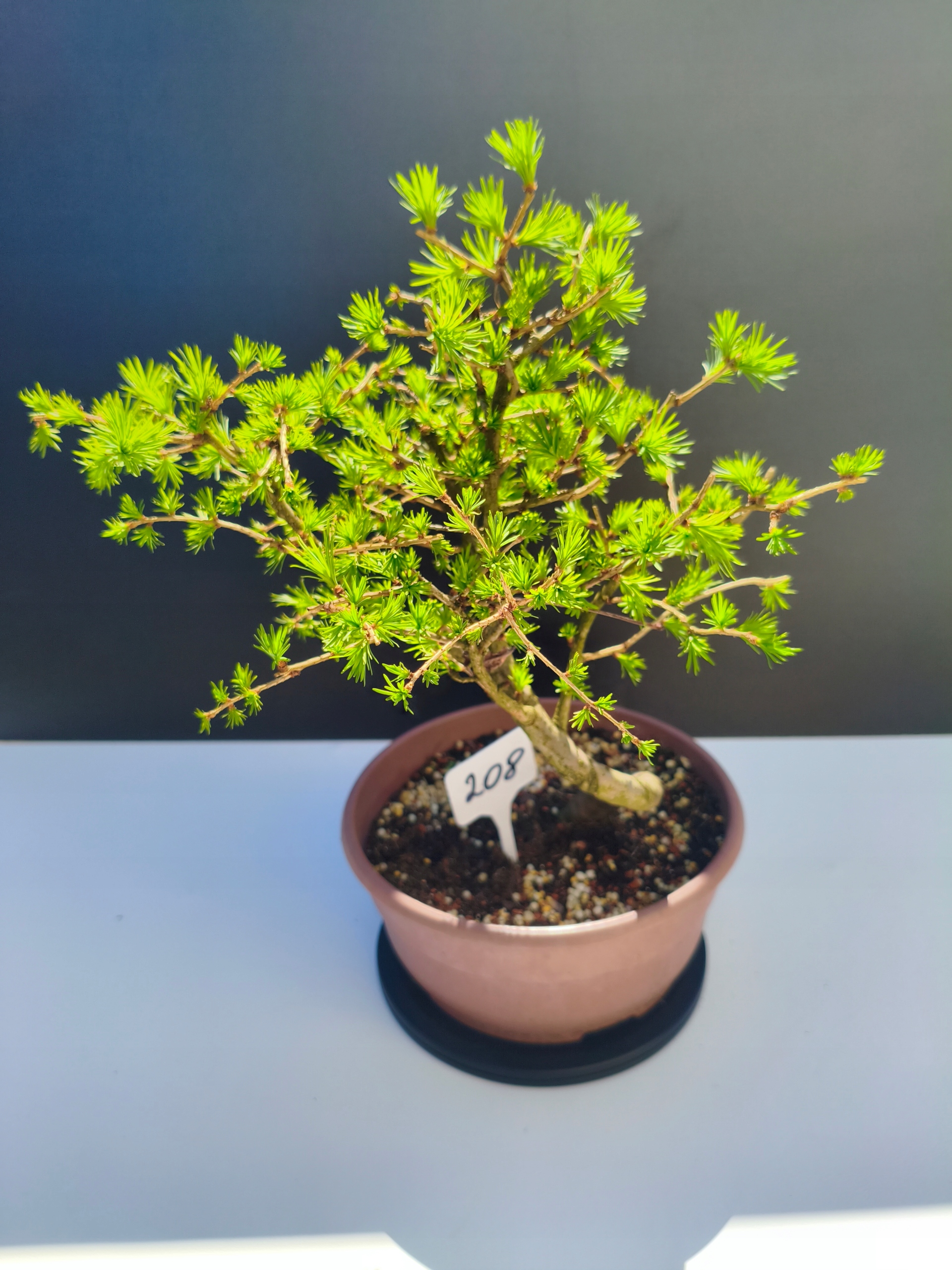 Każde nasze drzewko bonsai to unikalny egzemplarz, dlatego każde zostaje wystawione osobno, ponieważ traktujemy każde indywidualnie – od formowania po pielęgnację. Modrzewie te są w naszych rękach od 2021 roku i obecnie mają już 11 lat, dzięki czemu prezentują się wyjątkowo dojrzale i stabilnie.