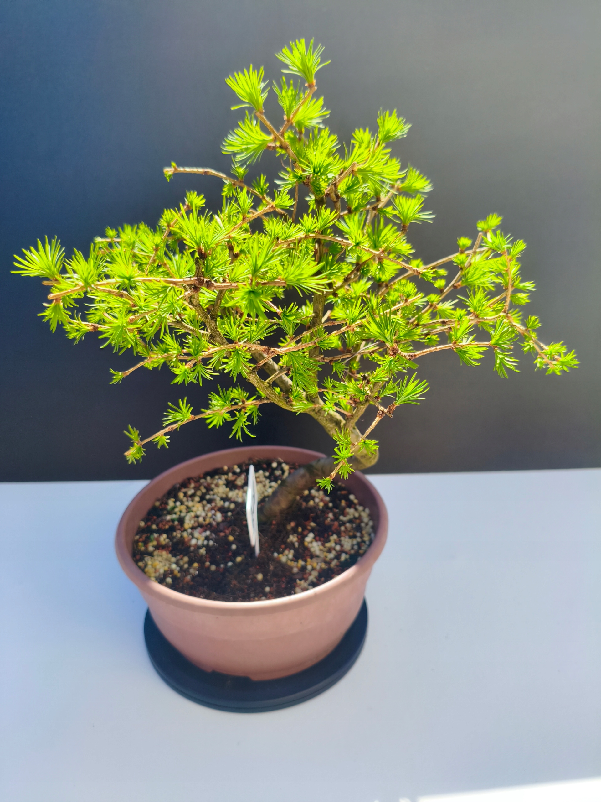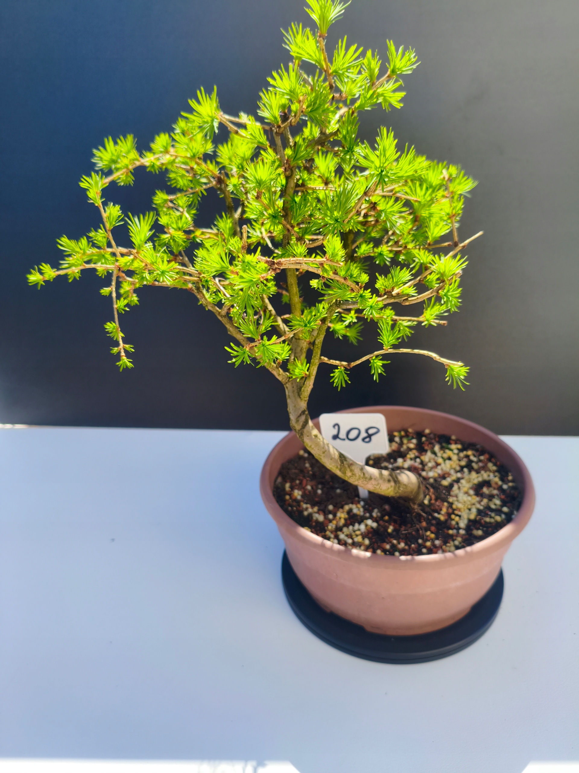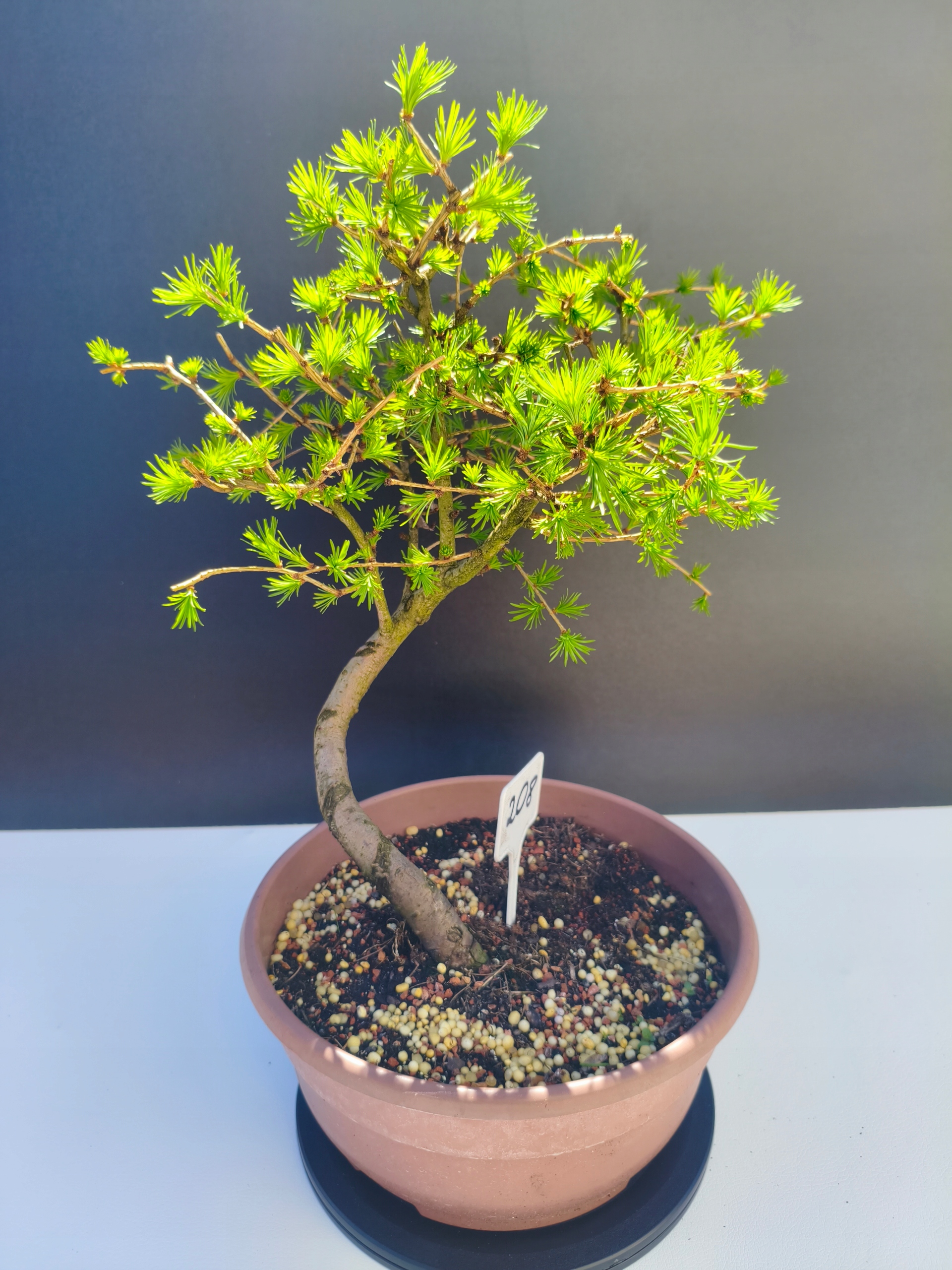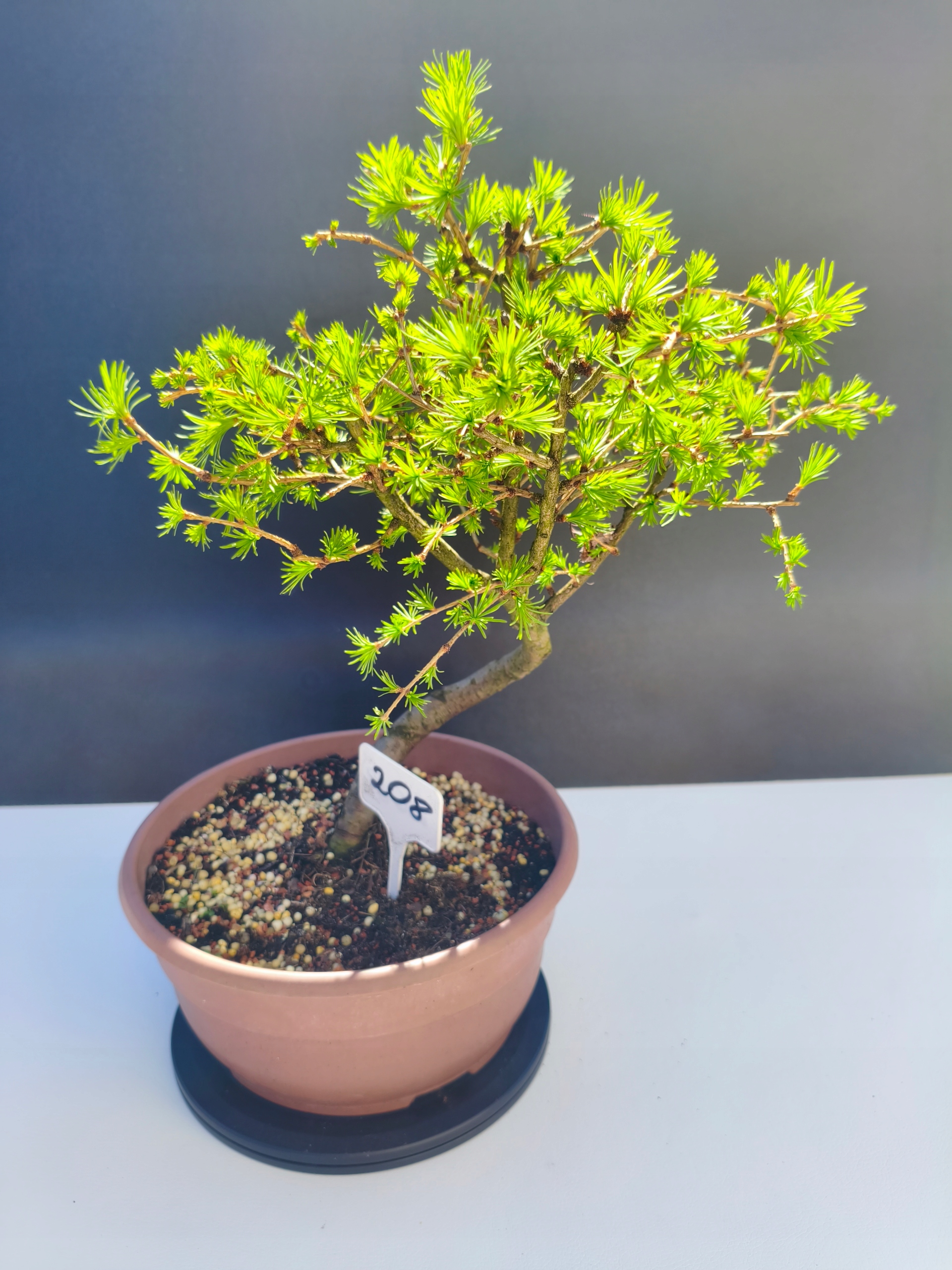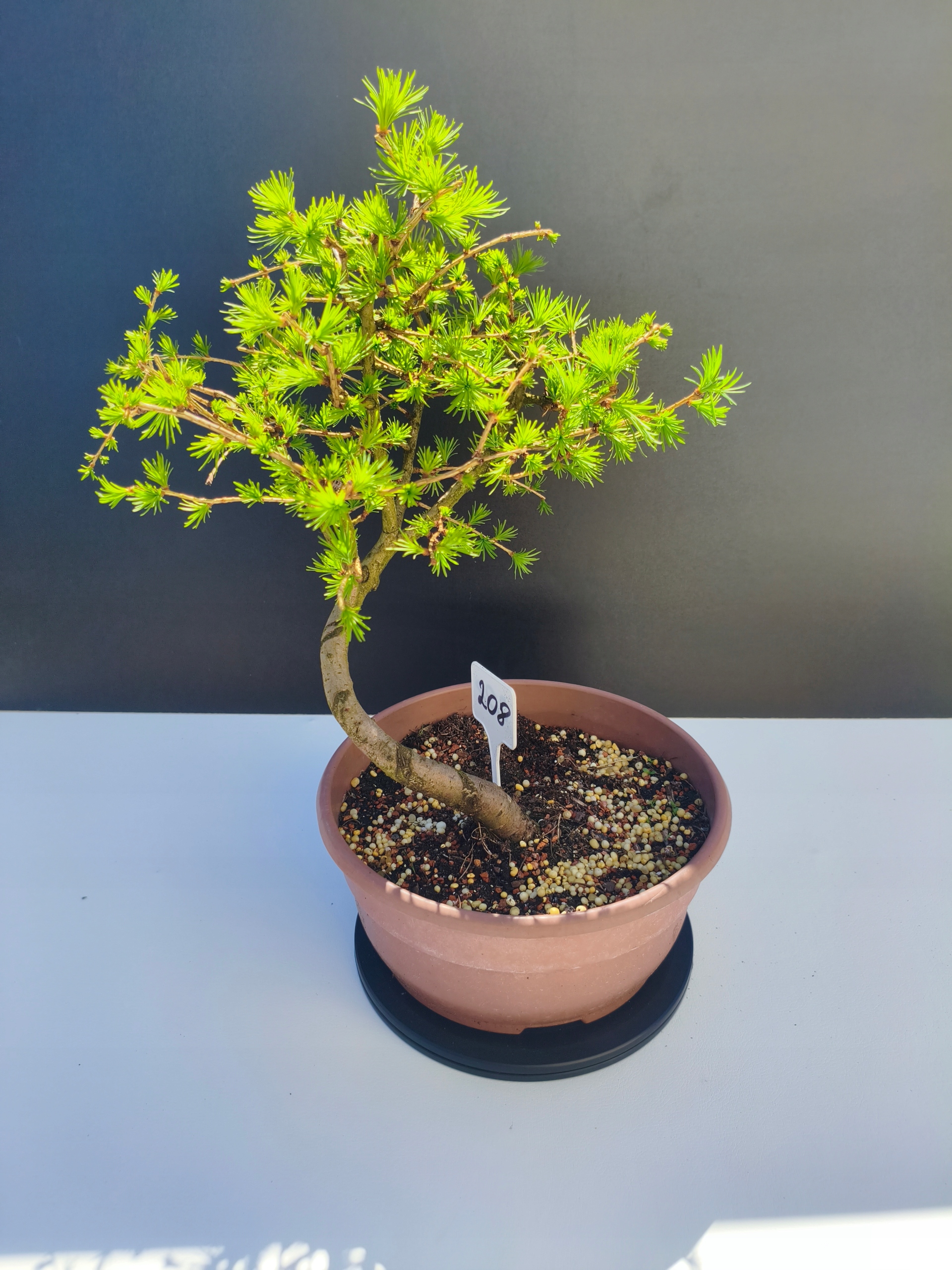 Każde nasze drzewko bonsai to unikalny egzemplarz, dlatego każde zostaje wystawione osobno, ponieważ traktujemy każde indywidualnie – od formowania po pielęgnację. Modrzewie te są w naszych rękach od 2021 roku i obecnie mają już 11 lat, dzięki czemu prezentują się wyjątkowo dojrzale i stabilnie.