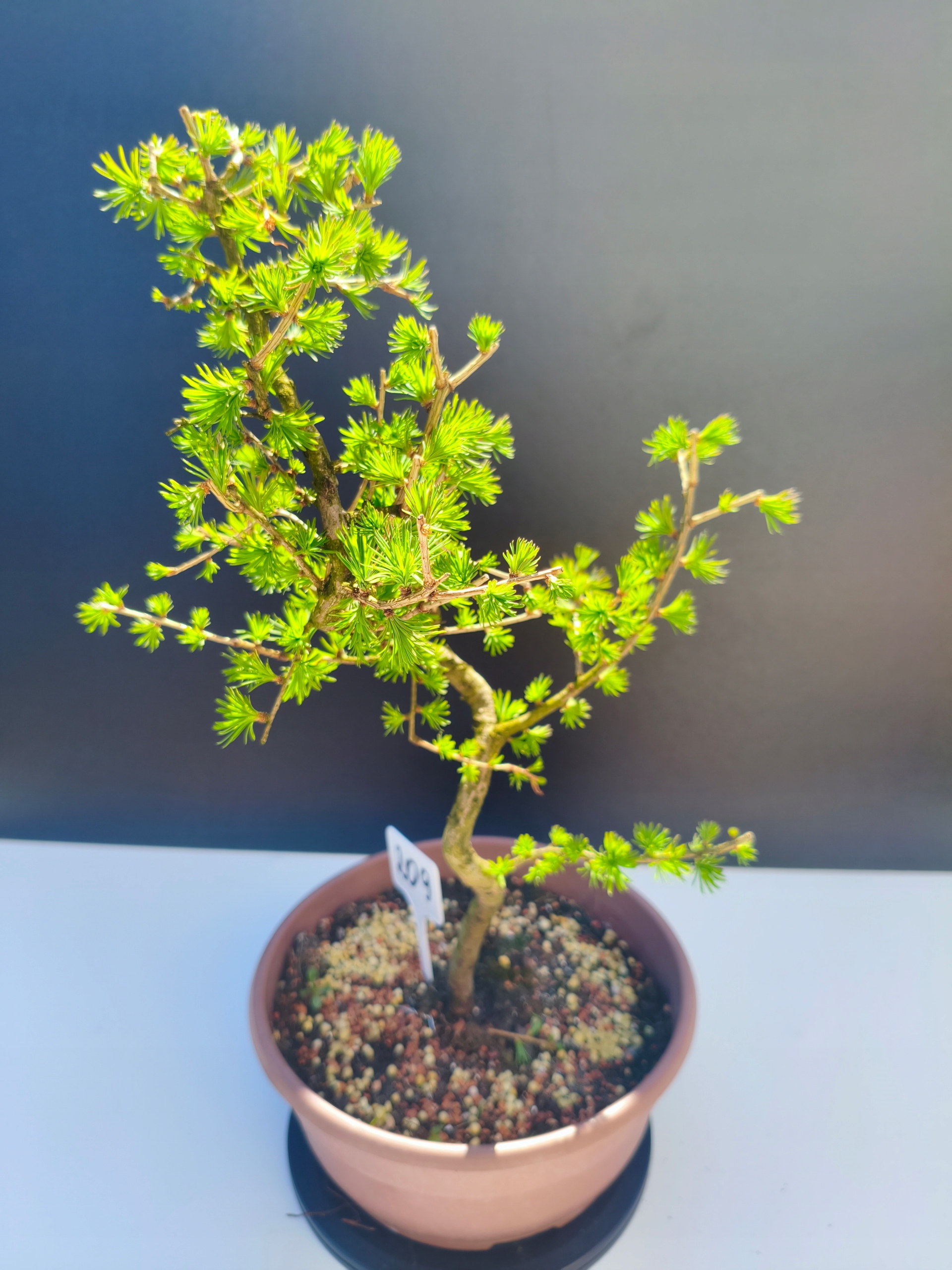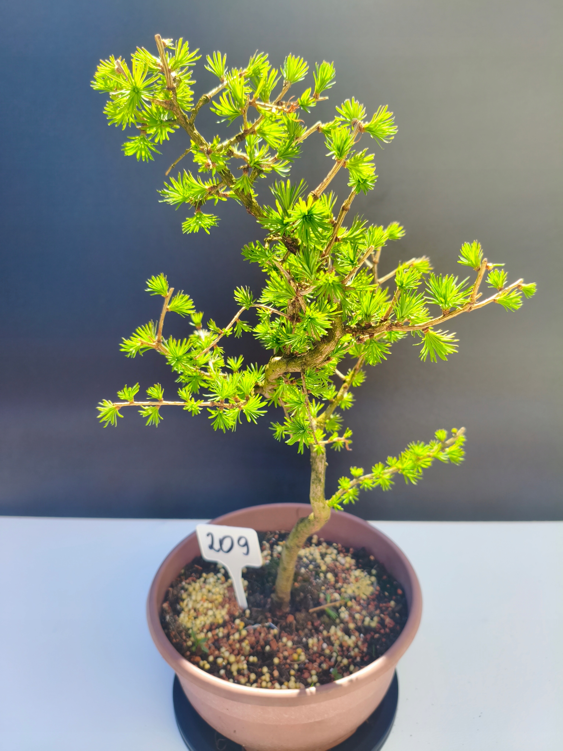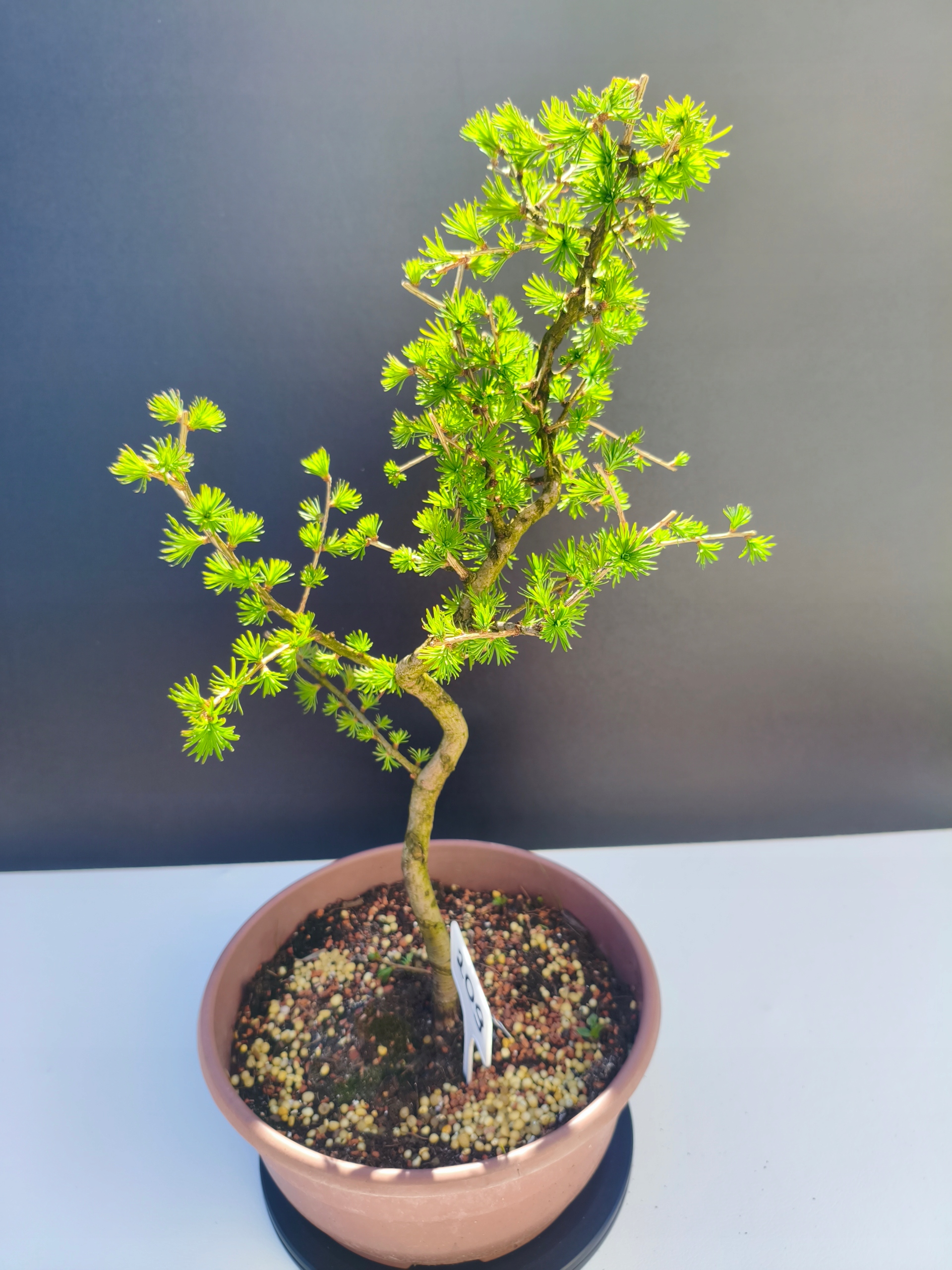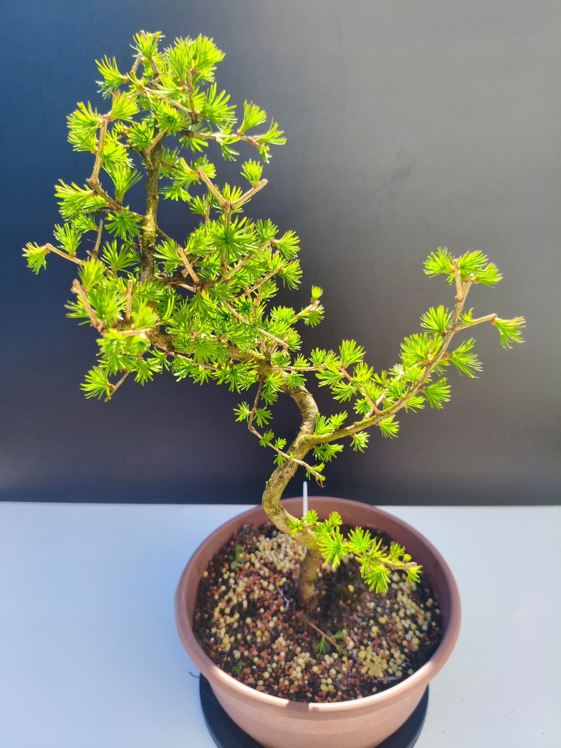 Każde nasze drzewko bonsai to unikalny egzemplarz, dlatego każde zostaje wystawione osobno, ponieważ traktujemy każde indywidualnie – od formowania po pielęgnację. Modrzewie te są w naszych rękach od 2021 roku i obecnie mają już 11 lat, dzięki czemu prezentują się wyjątkowo dojrzale i stabilnie.