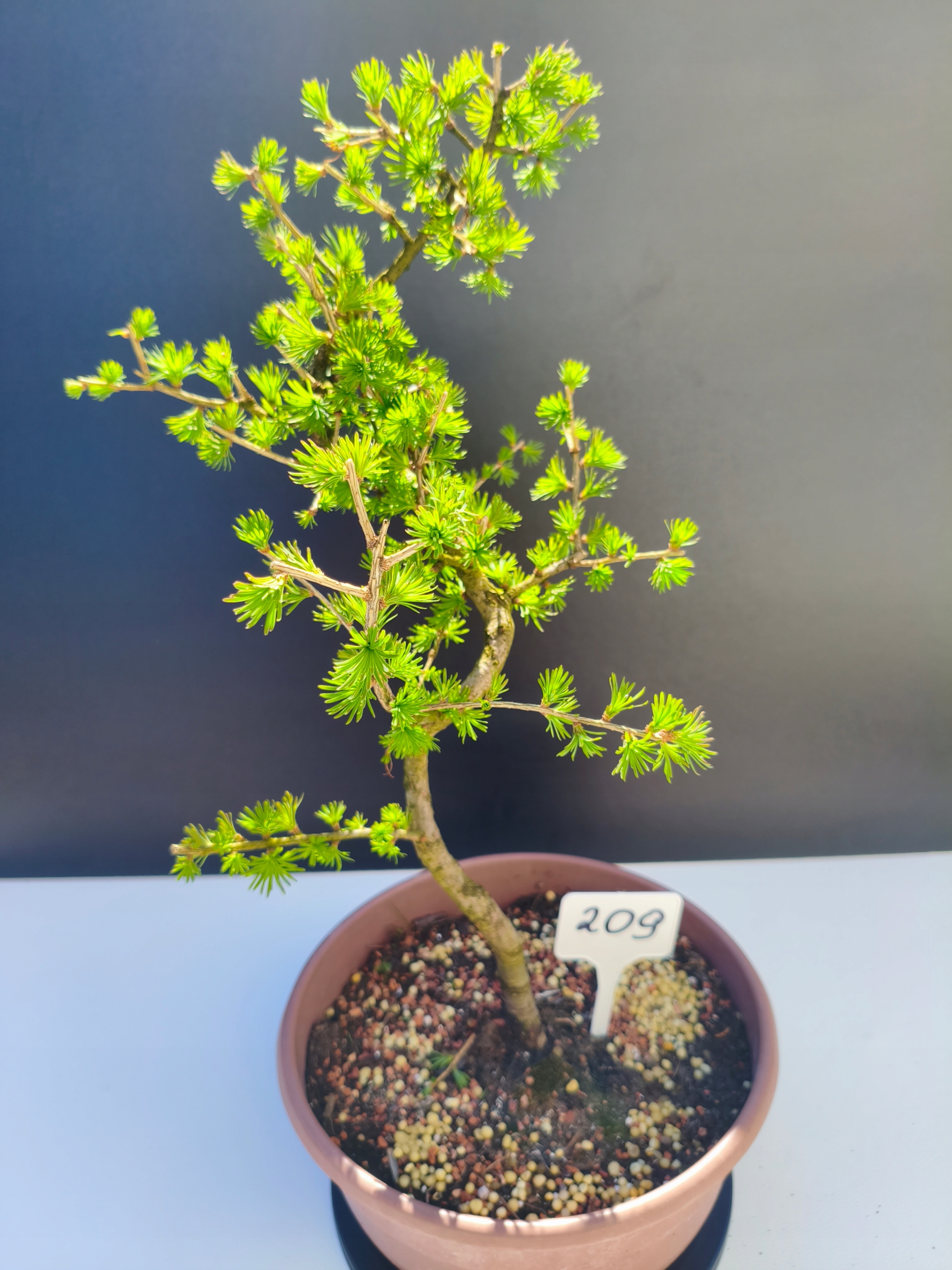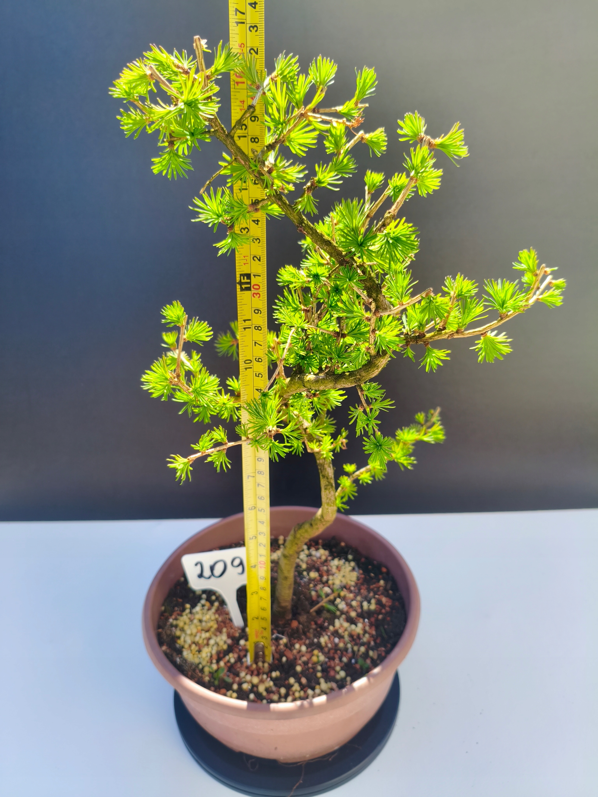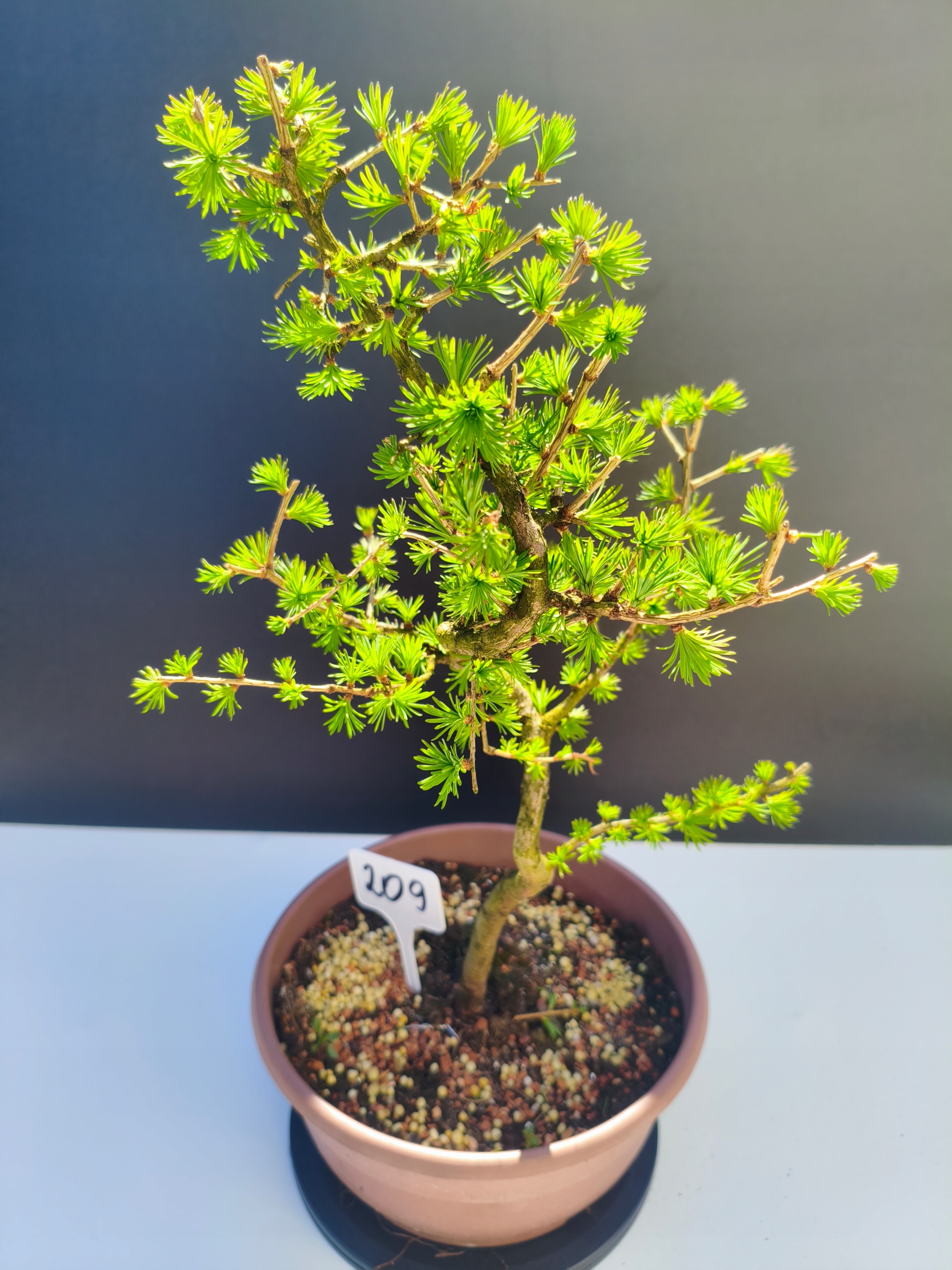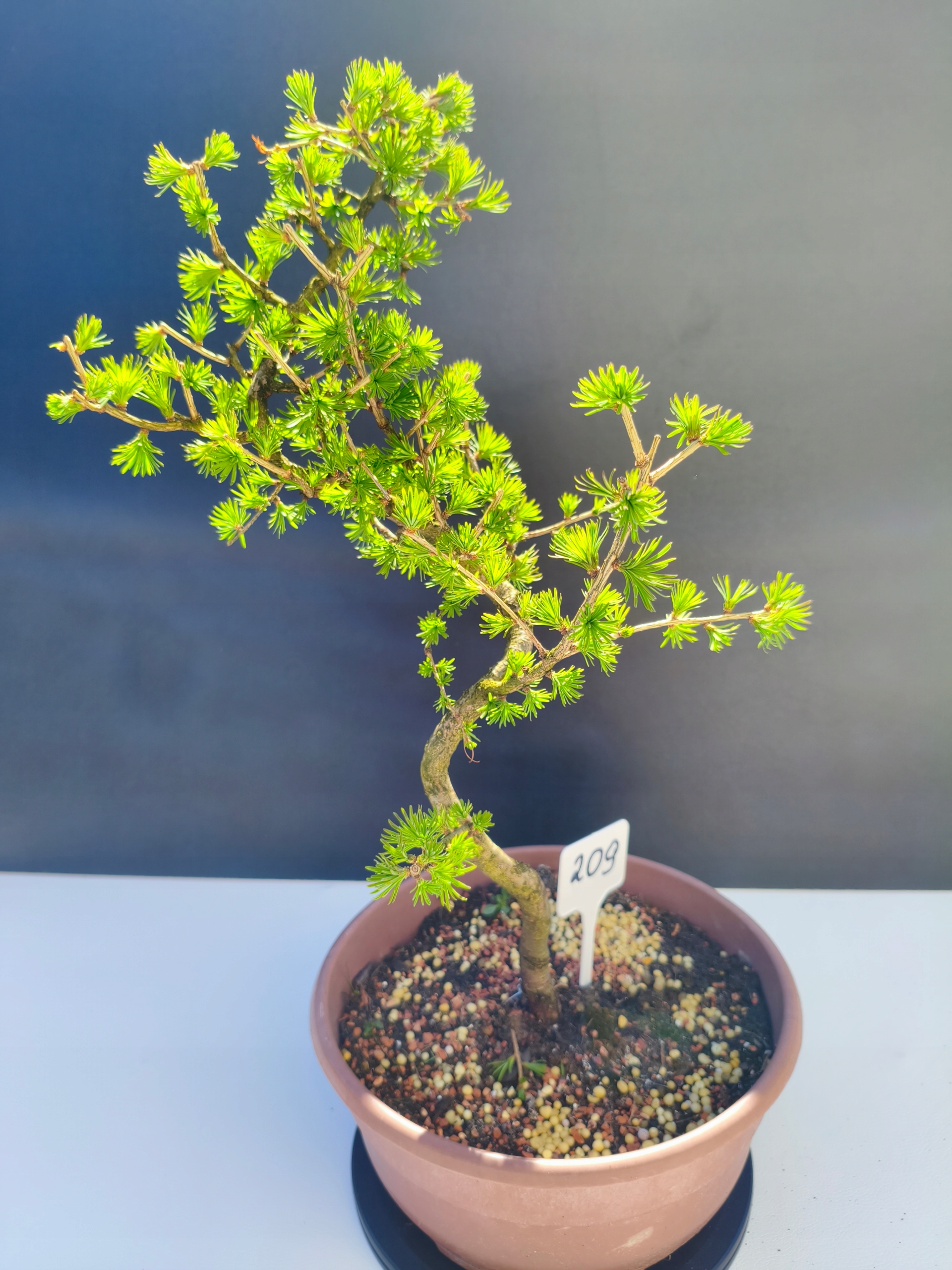 Każde nasze drzewko bonsai to unikalny egzemplarz, dlatego każde zostaje wystawione osobno, ponieważ traktujemy każde indywidualnie – od formowania po pielęgnację. Modrzewie te są w naszych rękach od 2021 roku i obecnie mają już 11 lat, dzięki czemu prezentują się wyjątkowo dojrzale i stabilnie.