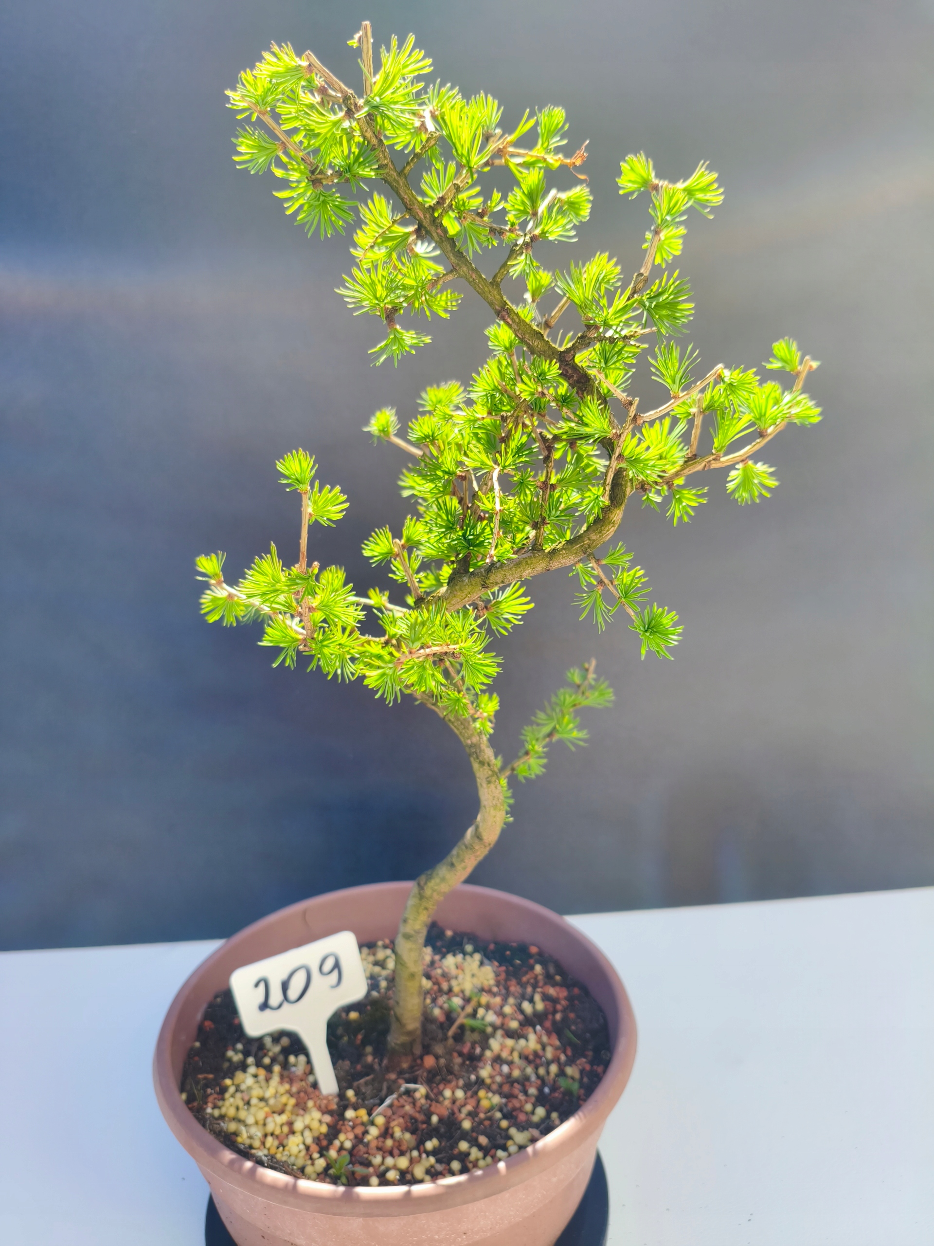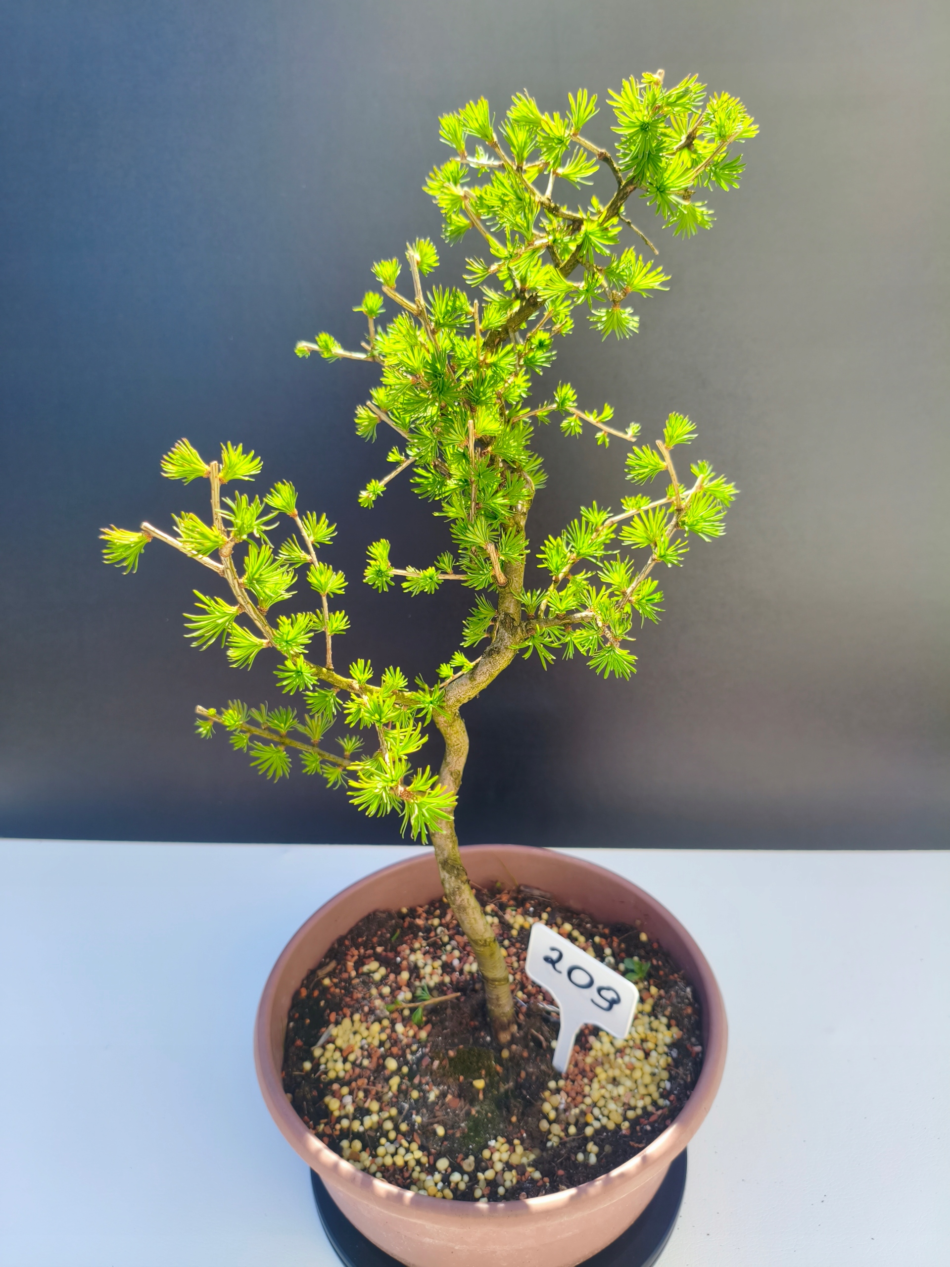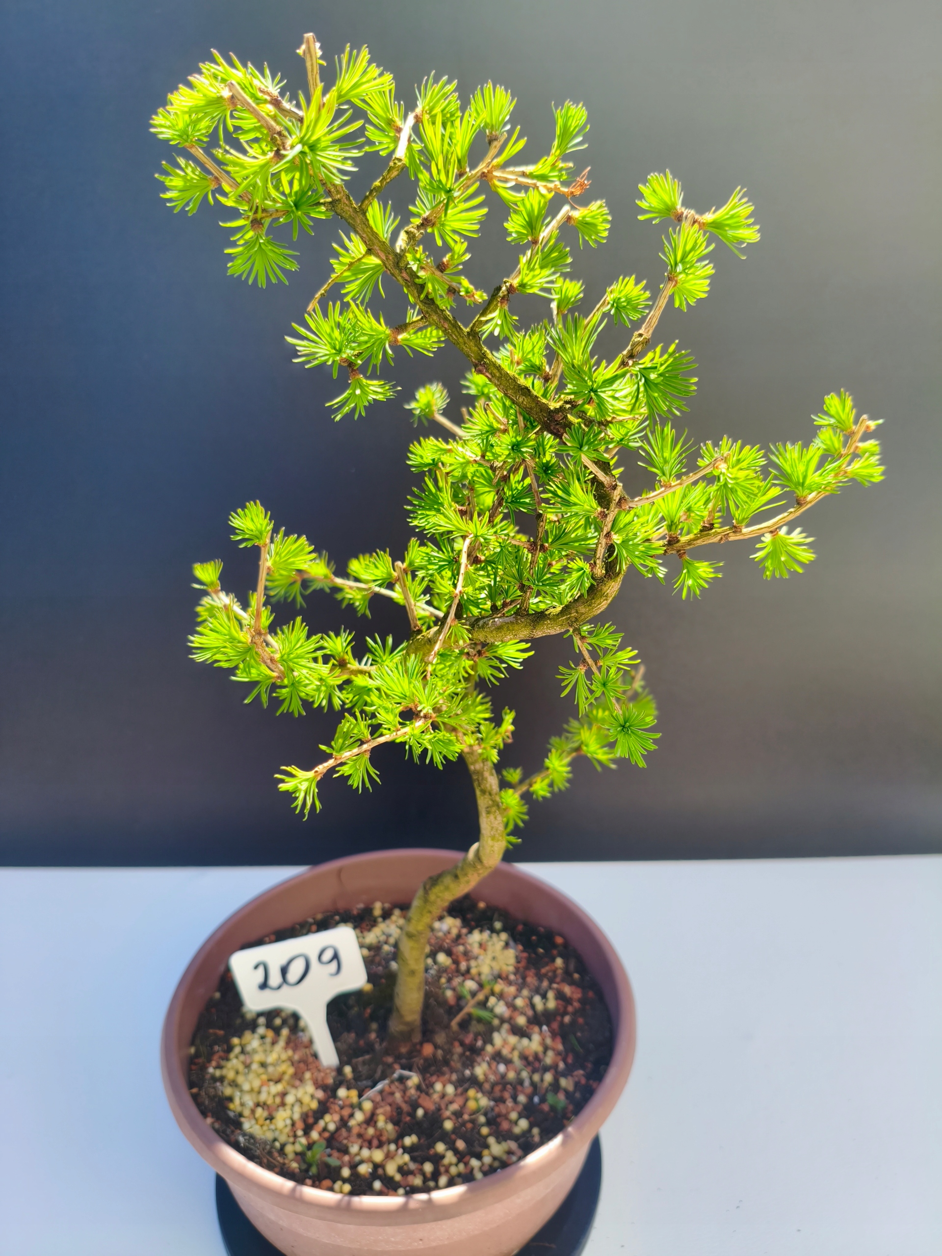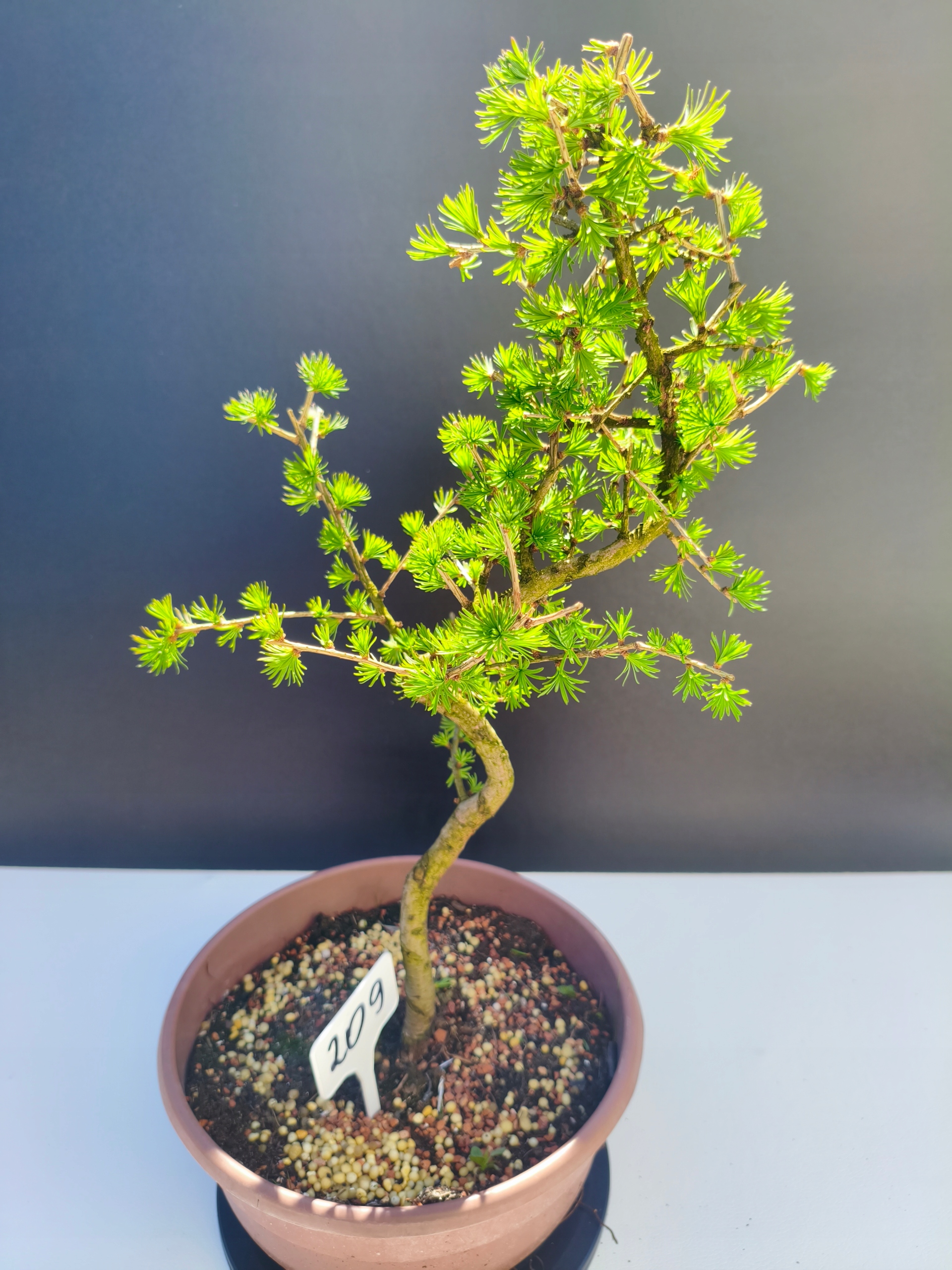 Każde nasze drzewko bonsai to unikalny egzemplarz, dlatego każde zostaje wystawione osobno, ponieważ traktujemy każde indywidualnie – od formowania po pielęgnację. Modrzewie te są w naszych rękach od 2021 roku i obecnie mają już 11 lat, dzięki czemu prezentują się wyjątkowo dojrzale i stabilnie.