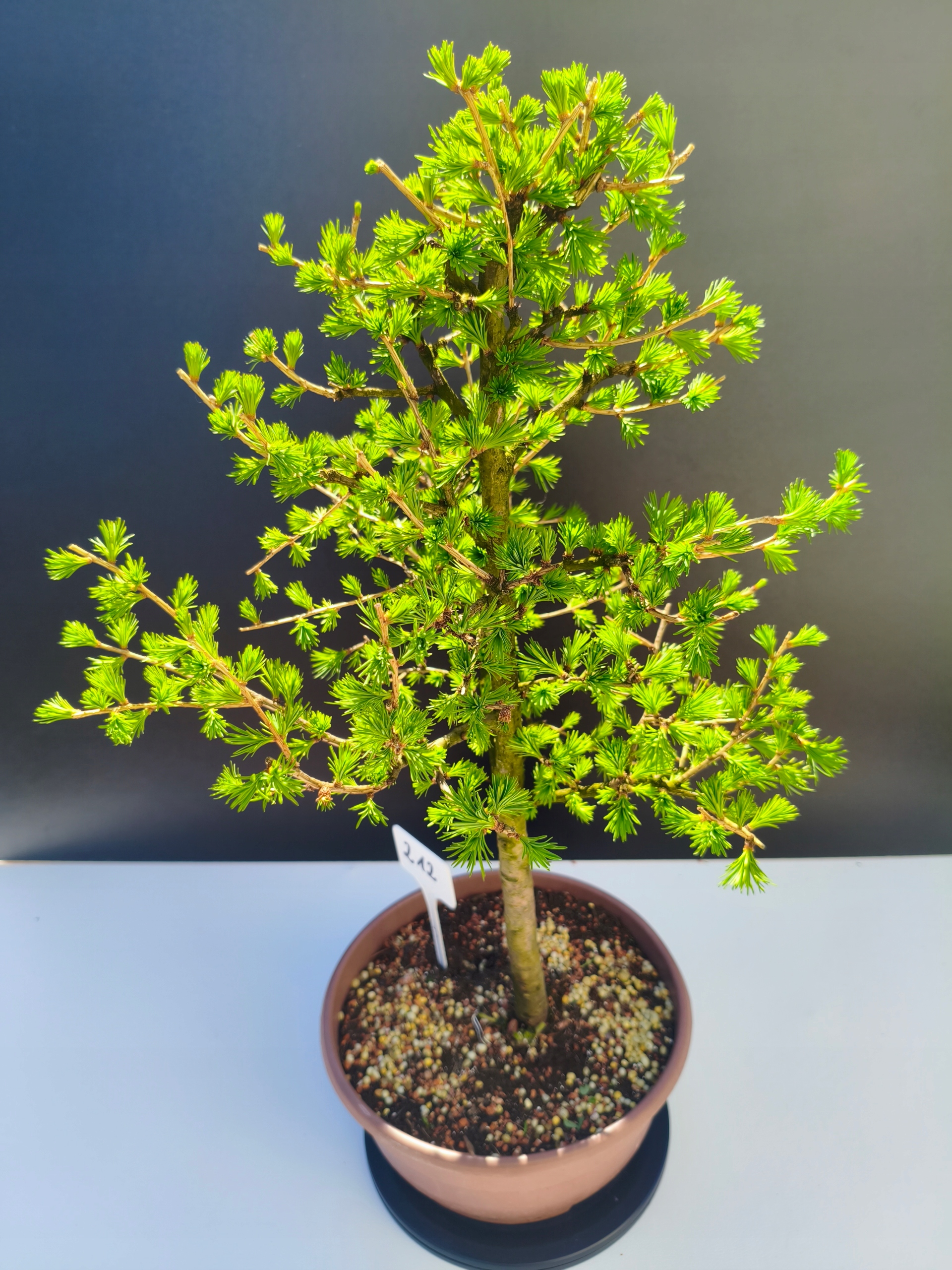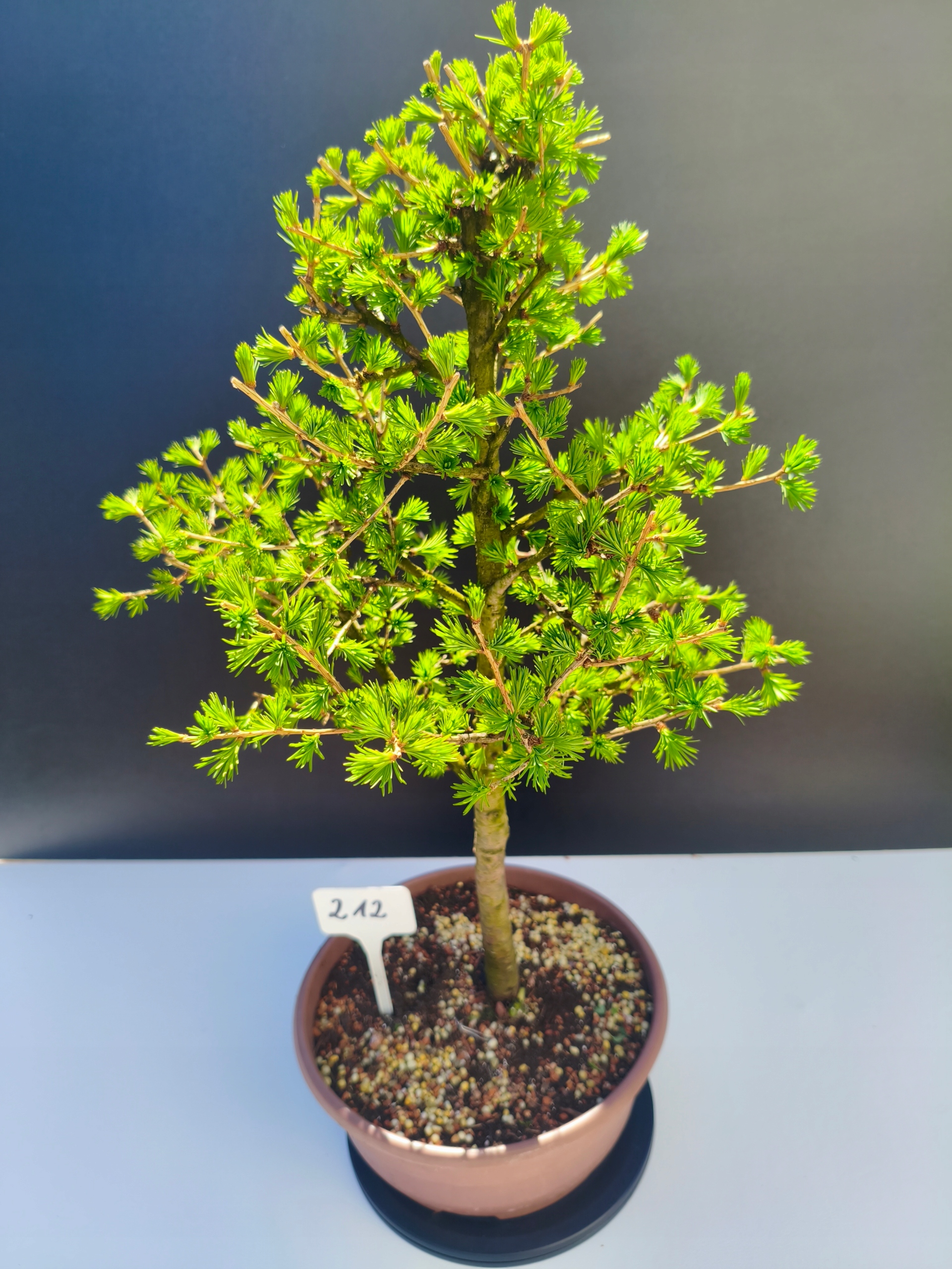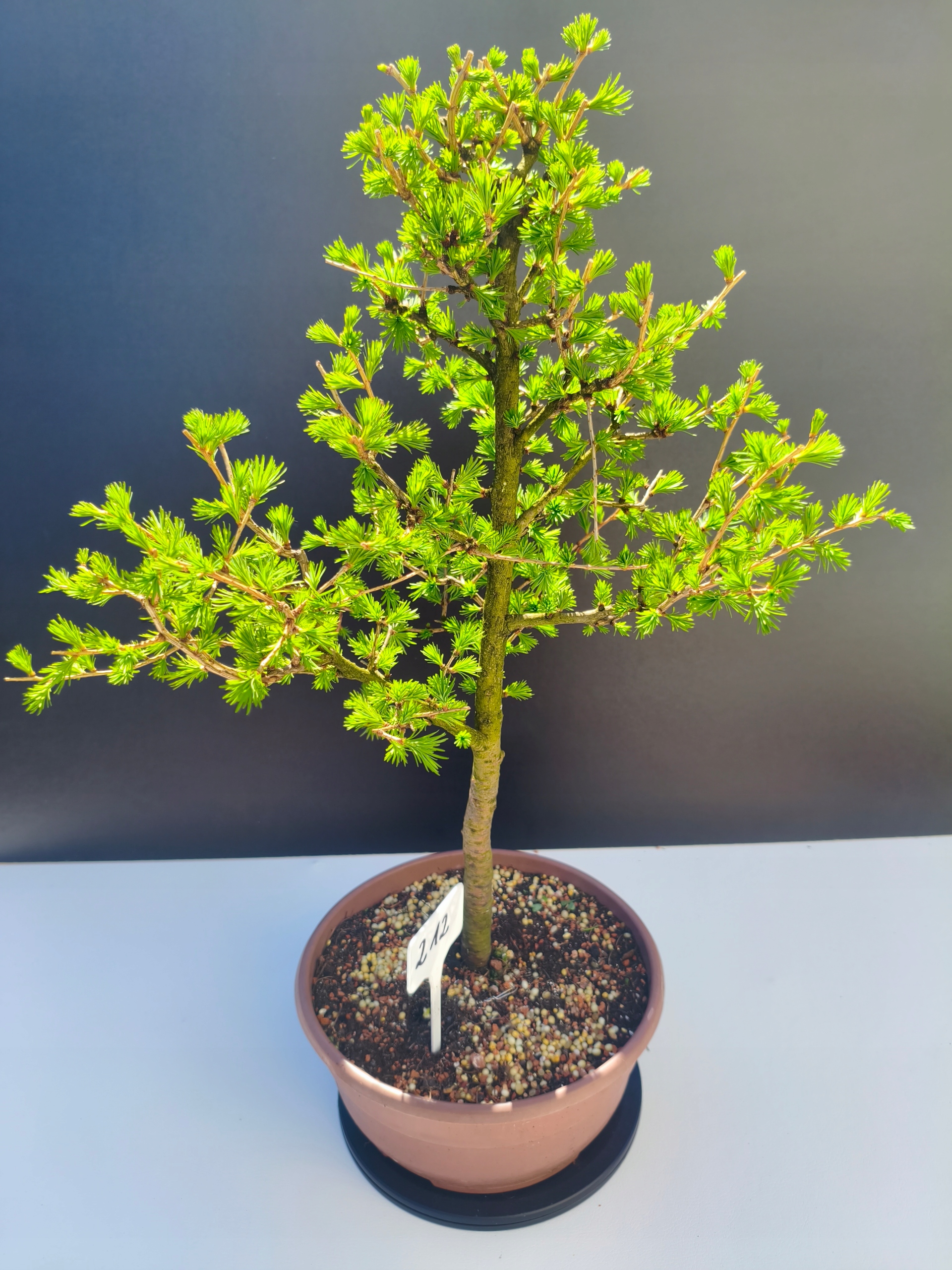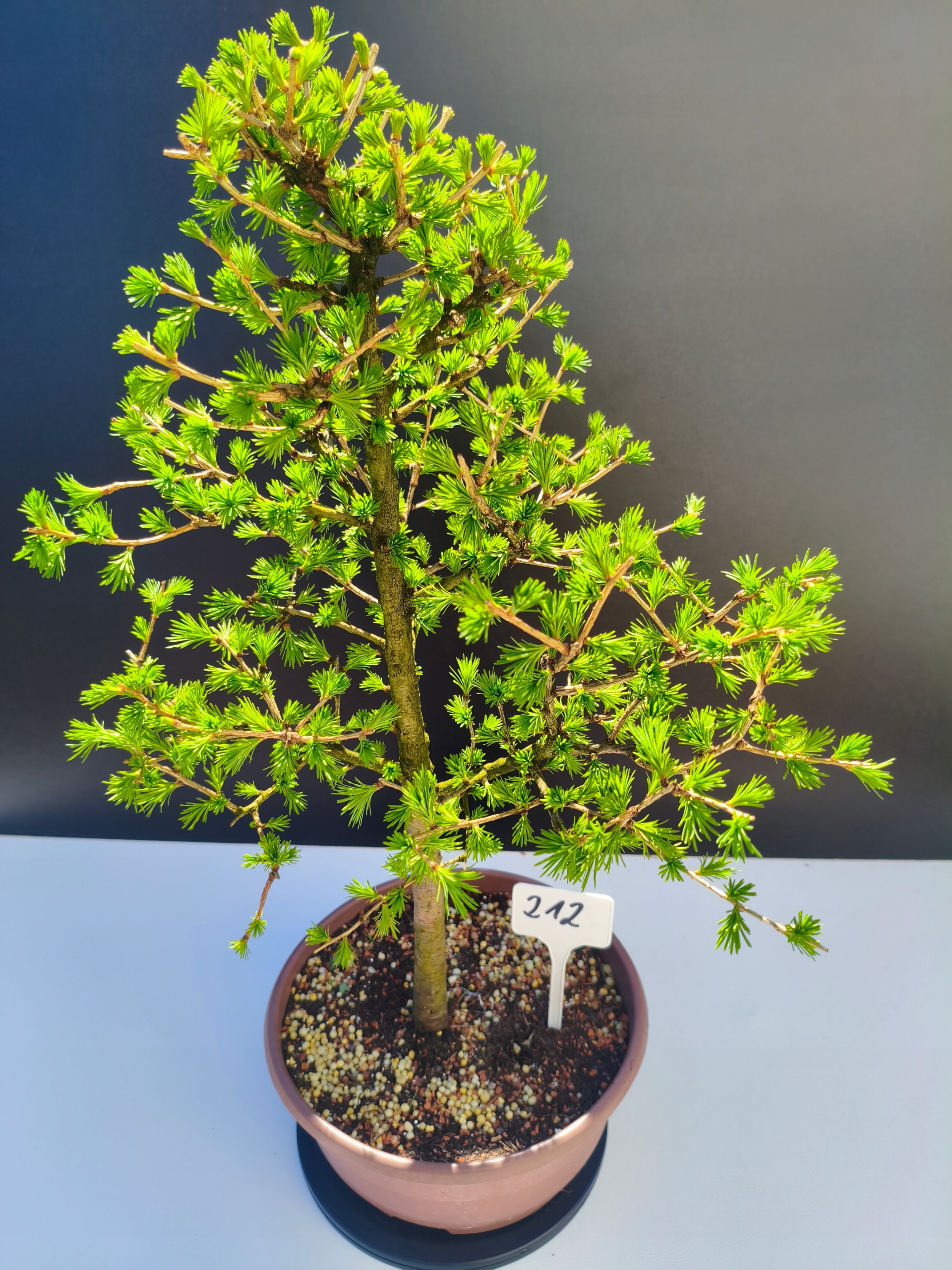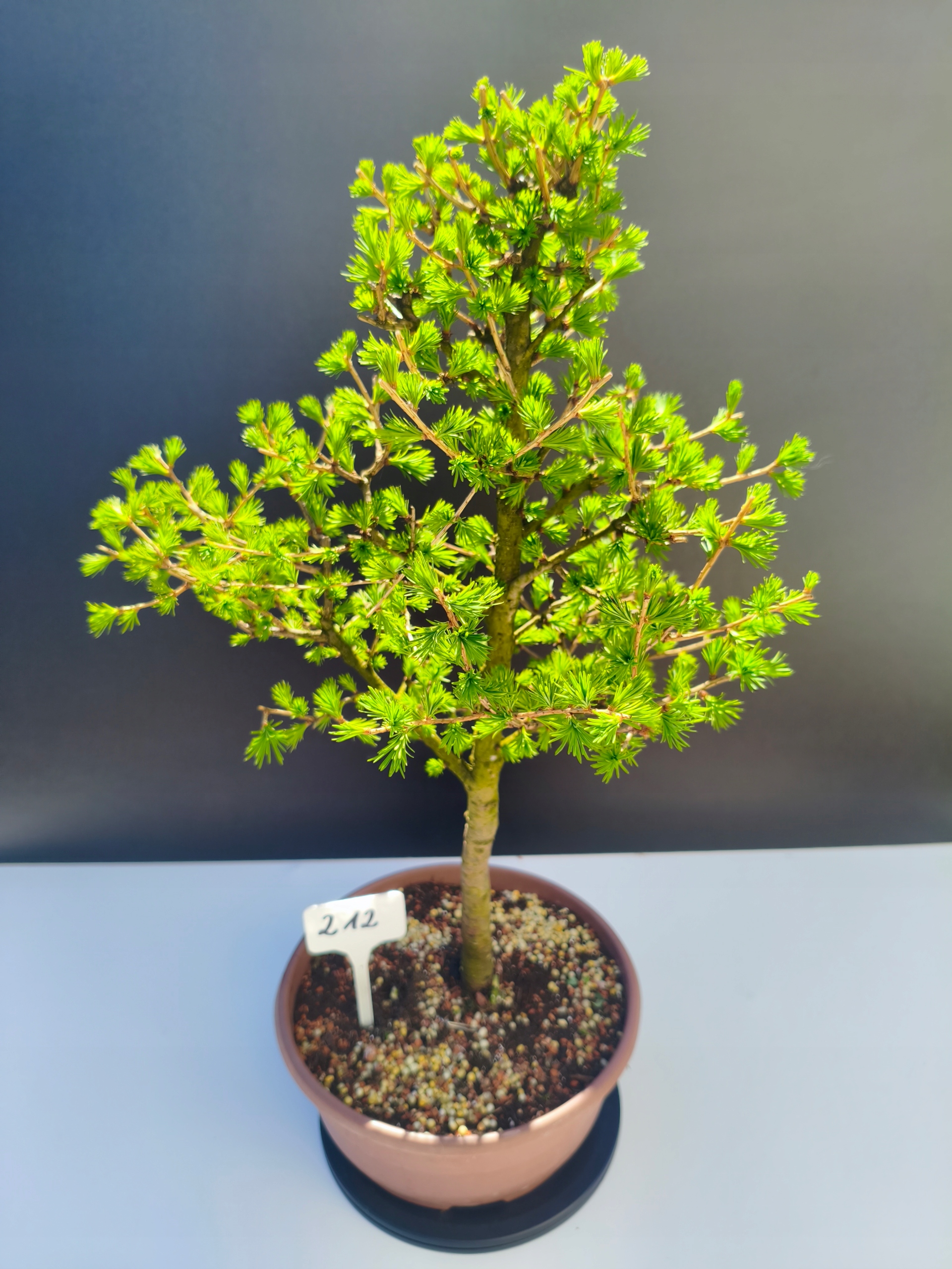 Każde nasze drzewko bonsai to unikalny egzemplarz, dlatego każde zostaje wystawione osobno, ponieważ traktujemy każde indywidualnie – od formowania po pielęgnację. Modrzewie te są w naszych rękach od 2021 roku i obecnie mają już 11 lat, dzięki czemu prezentują się wyjątkowo dojrzale i stabilnie.
