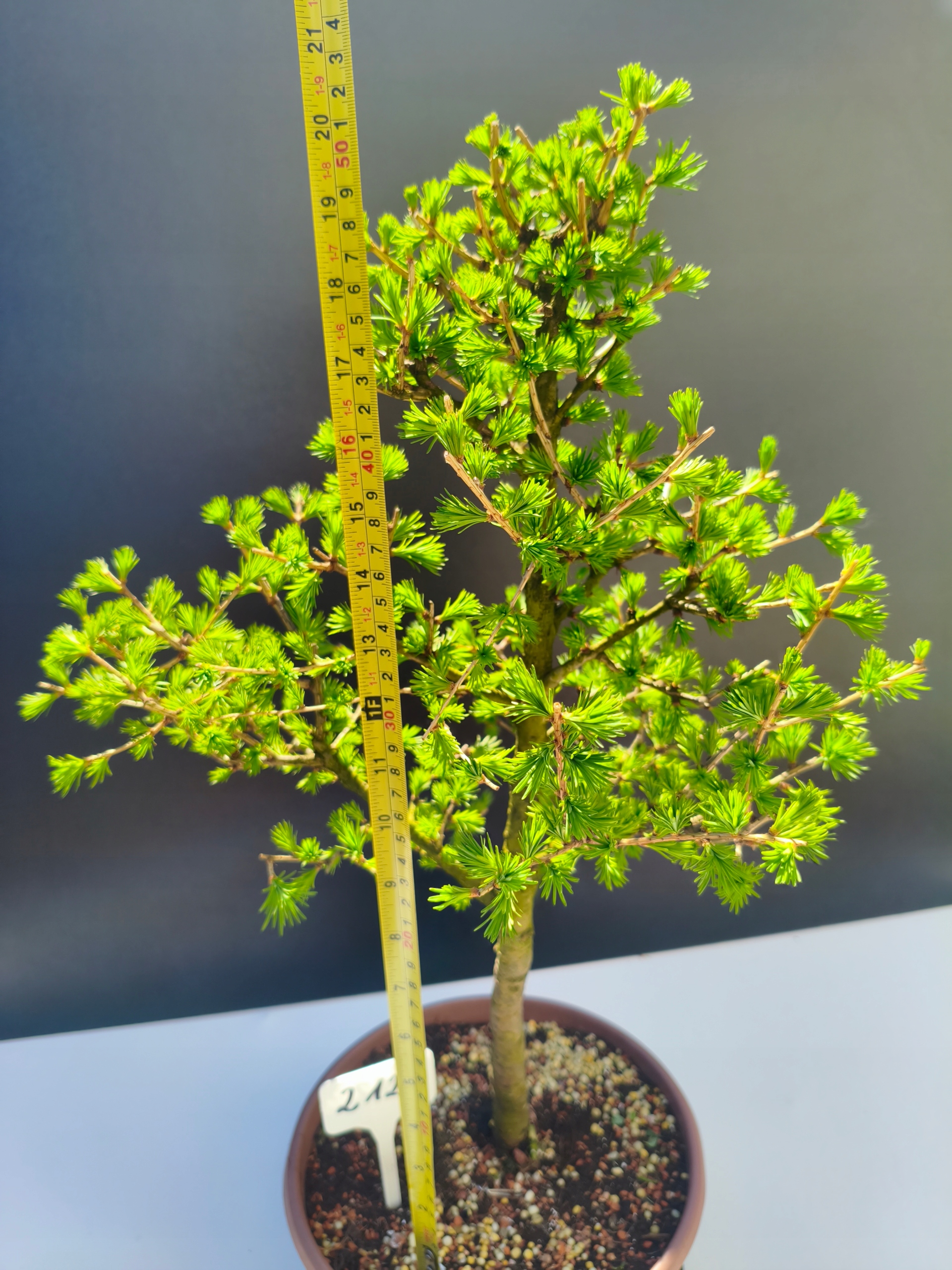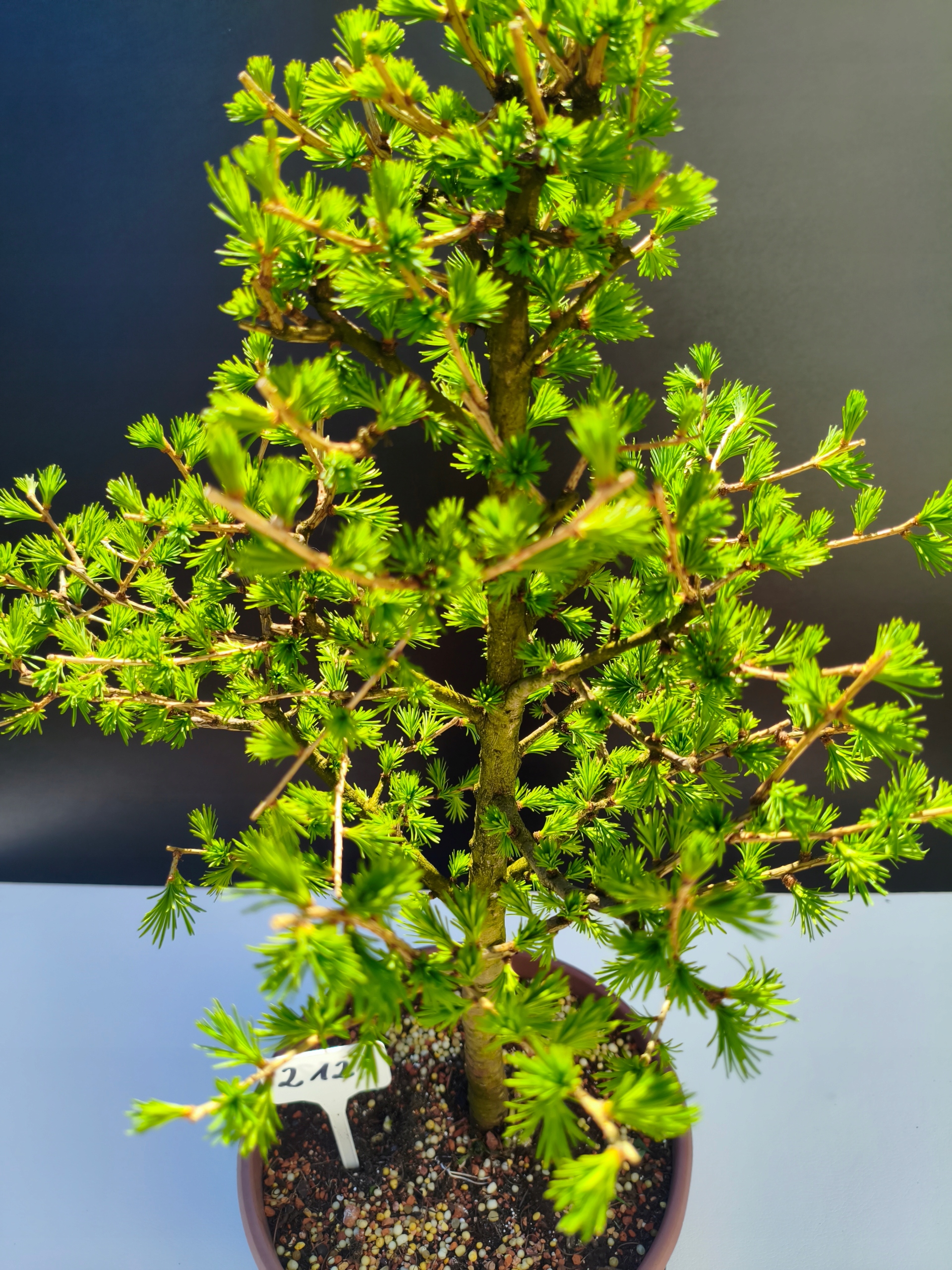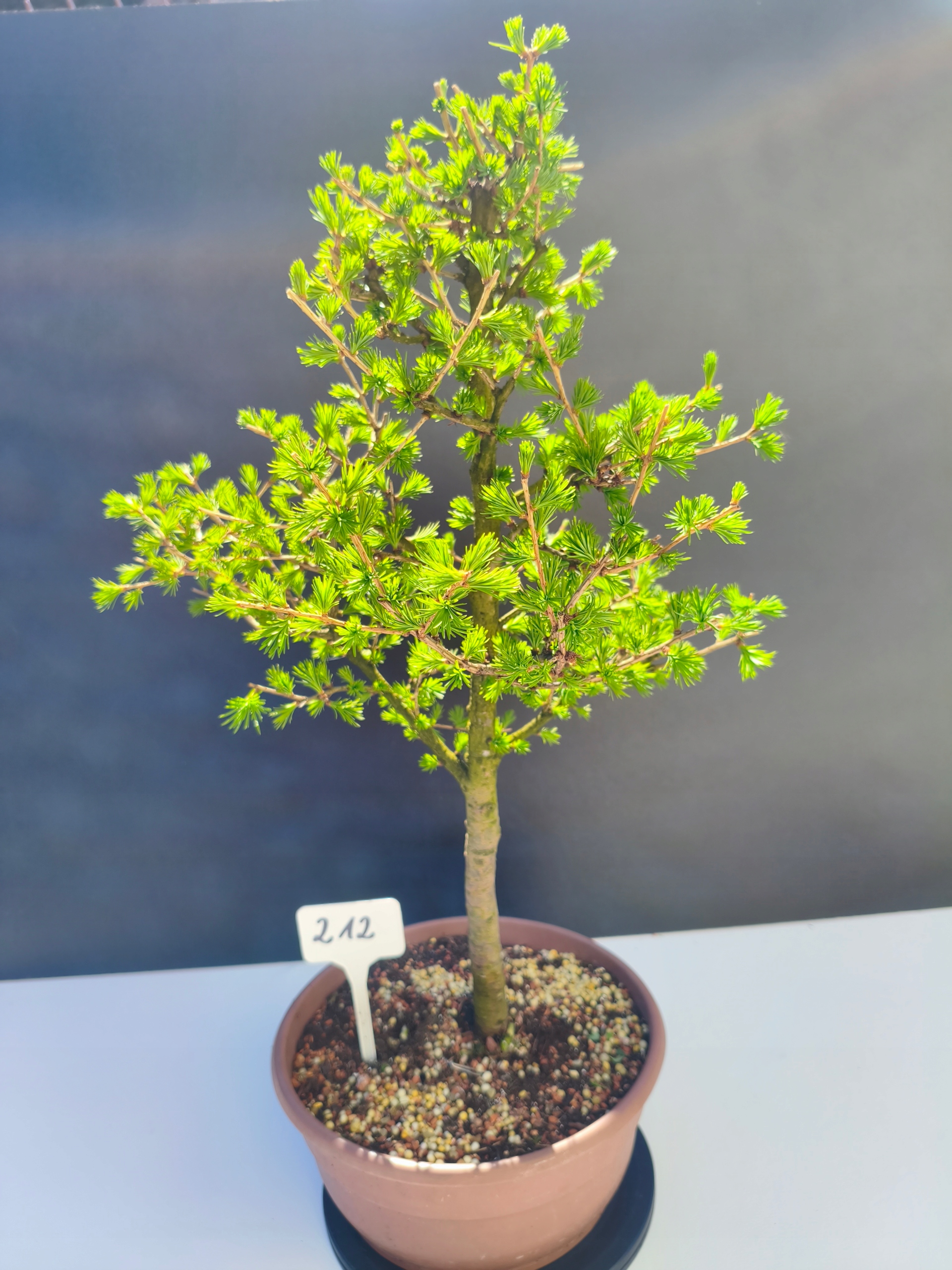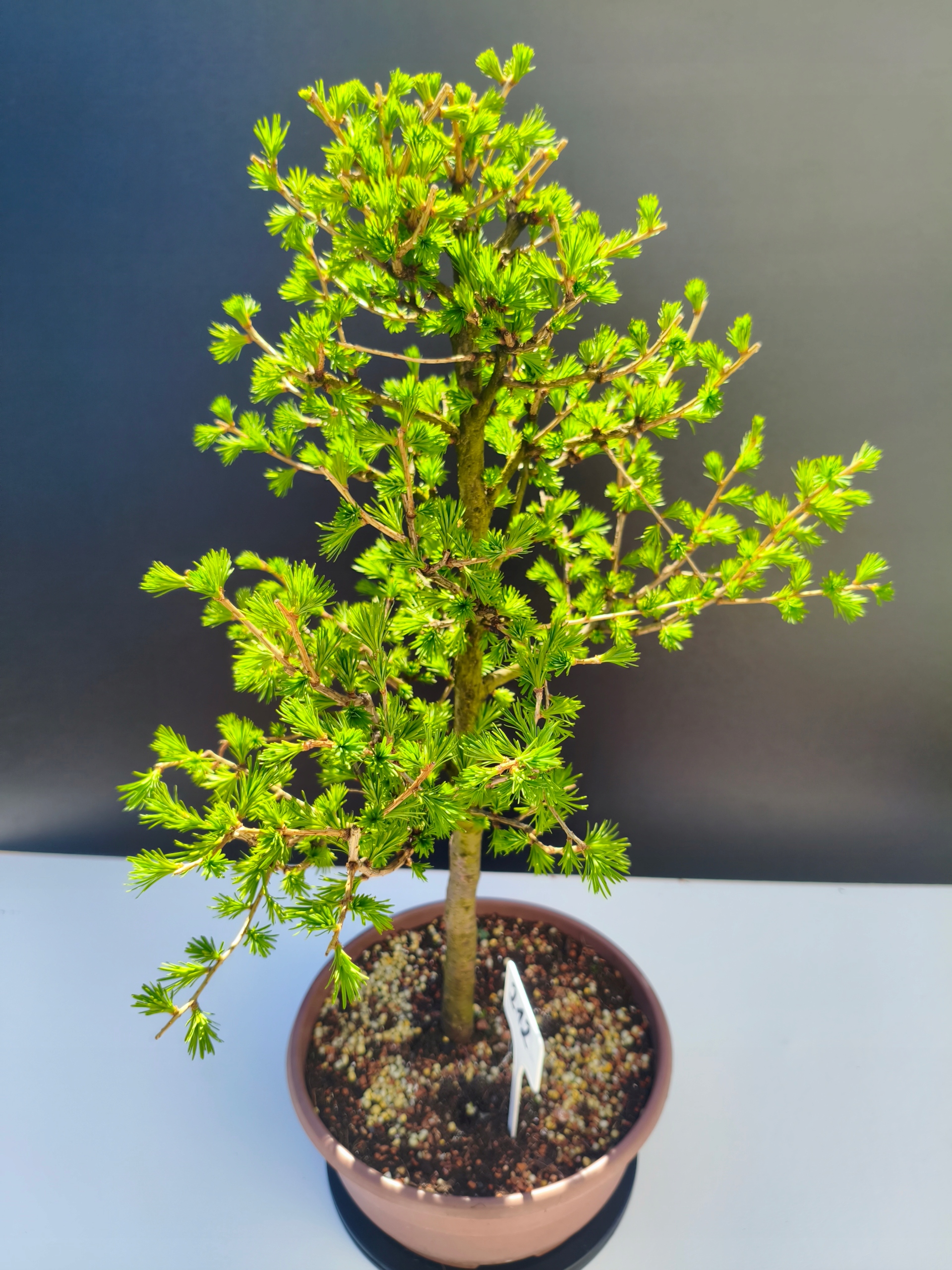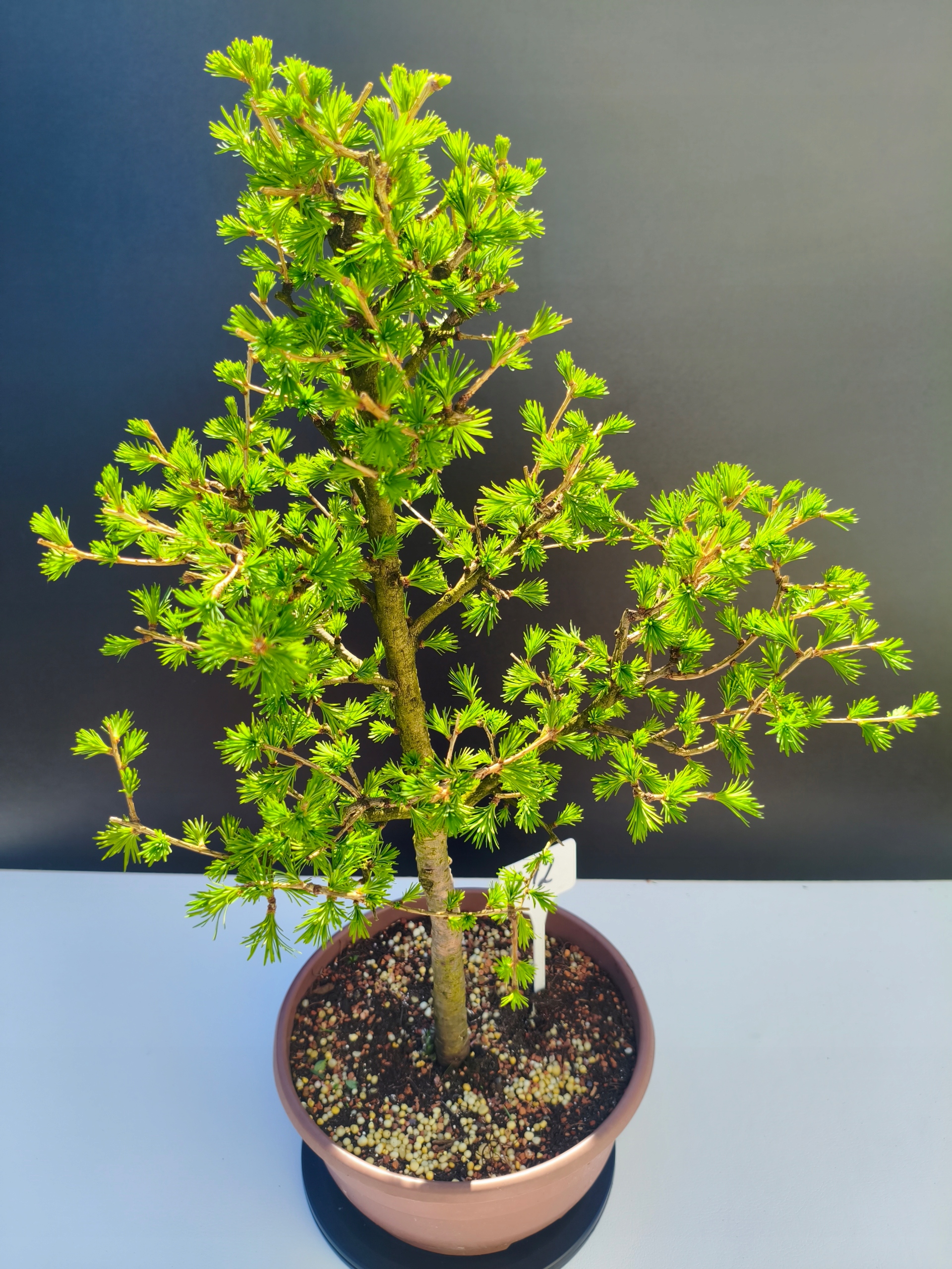 Każde nasze drzewko bonsai to unikalny egzemplarz, dlatego każde zostaje wystawione osobno, ponieważ traktujemy każde indywidualnie – od formowania po pielęgnację. Modrzewie te są w naszych rękach od 2021 roku i obecnie mają już 11 lat, dzięki czemu prezentują się wyjątkowo dojrzale i stabilnie.