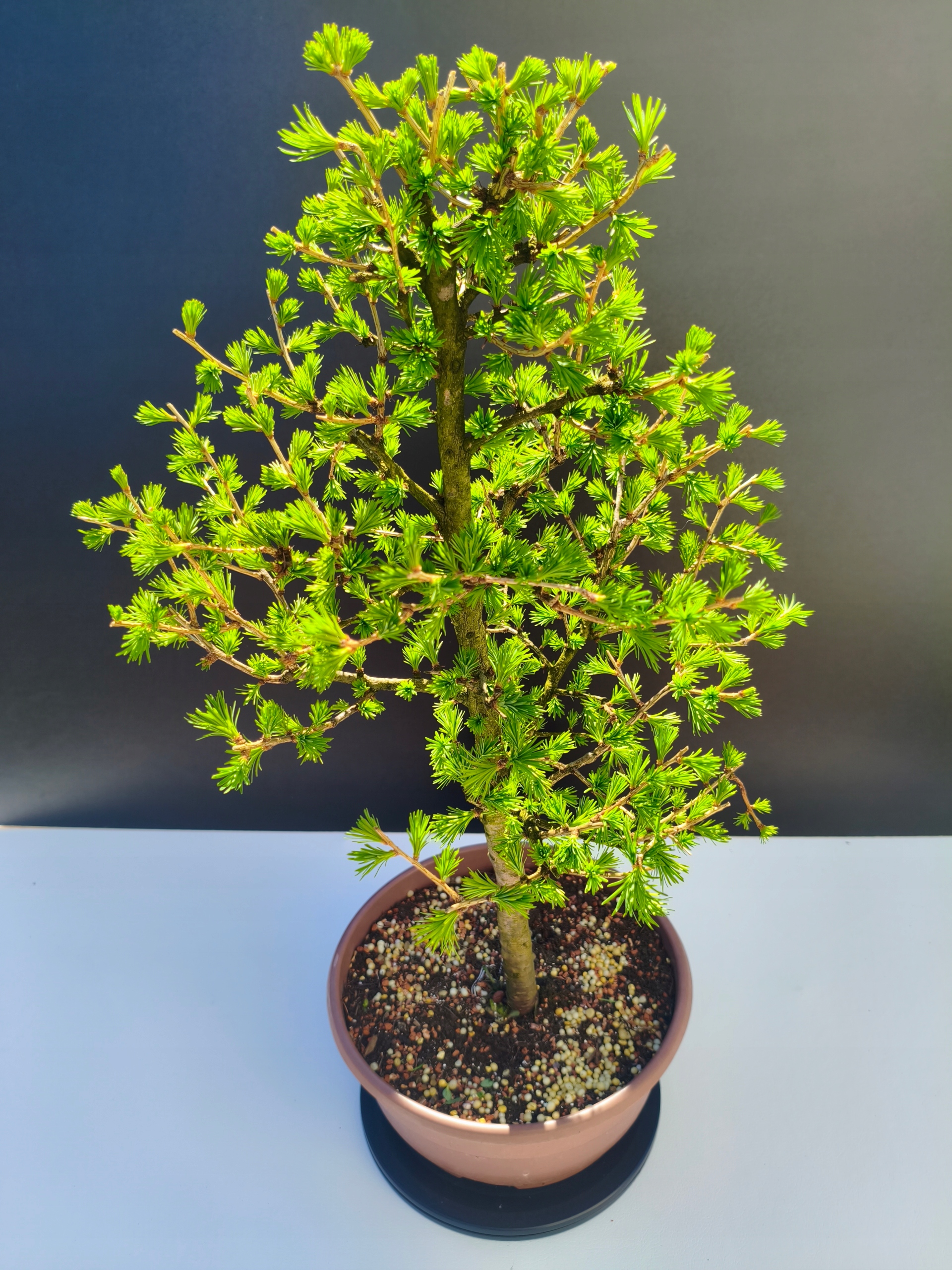 Naturalny rytm – piękno zmienności Modrzew europejski to wyjątkowe bonsai, które jesienią naturalnie zrzuca igły, aby na wiosnę wypuścić nowe, soczyście zielone przyrosty. To jedno z nielicznych drzewek iglastych z tak wyraźnym sezonowym cyklem – co czyni je jeszcze bardziej fascynującym.