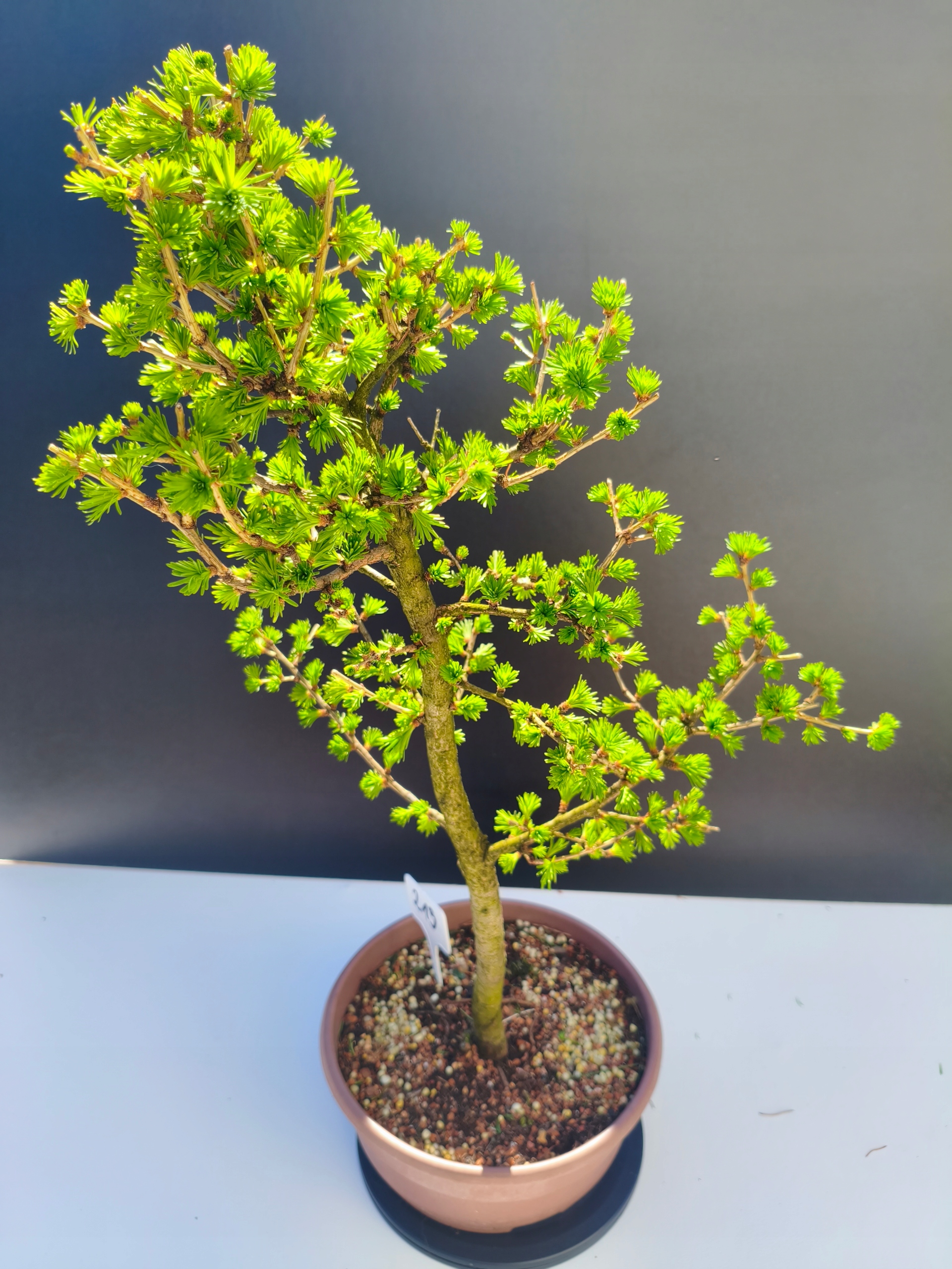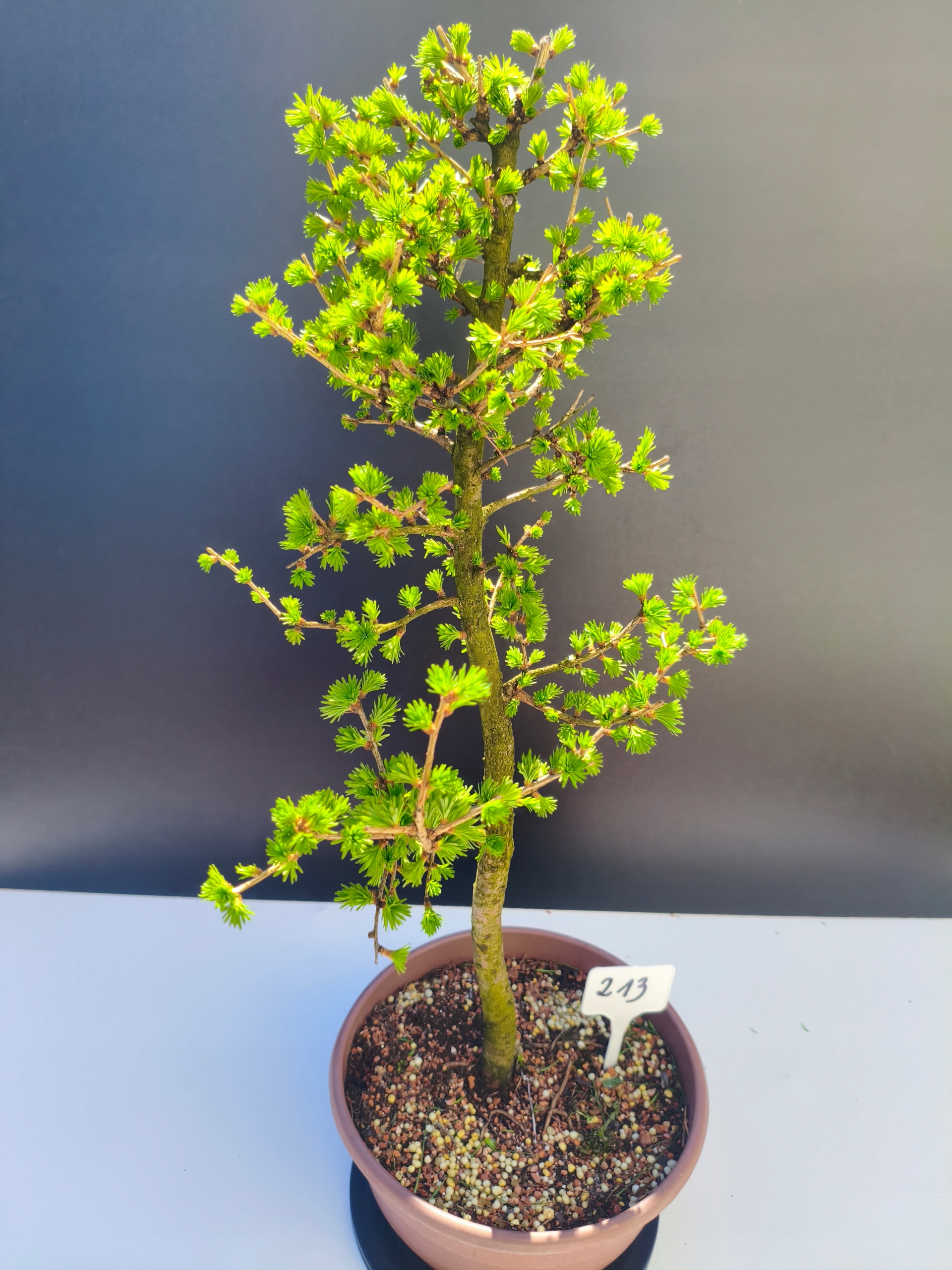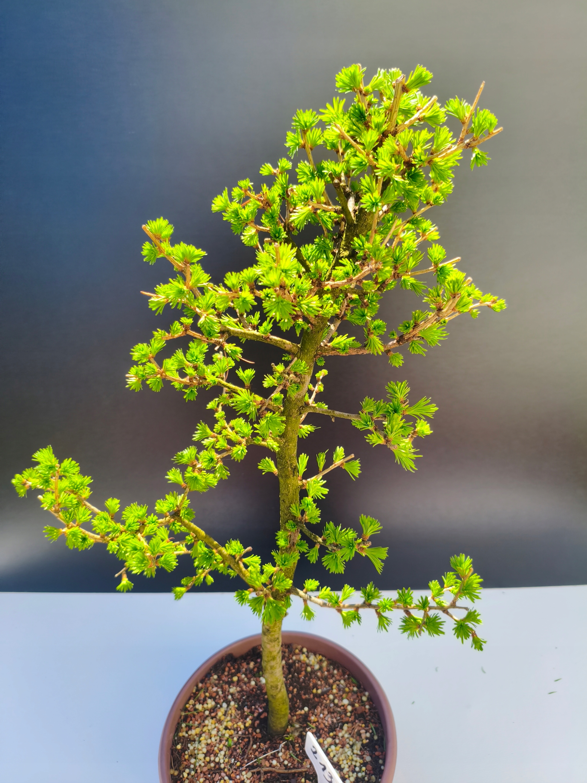 Każde nasze drzewko bonsai to unikalny egzemplarz, dlatego każde zostaje wystawione osobno, ponieważ traktujemy każde indywidualnie – od formowania po pielęgnację. Modrzewie te są w naszych rękach od 2021 roku i obecnie mają już 11 lat, dzięki czemu prezentują się wyjątkowo dojrzale i stabilnie.