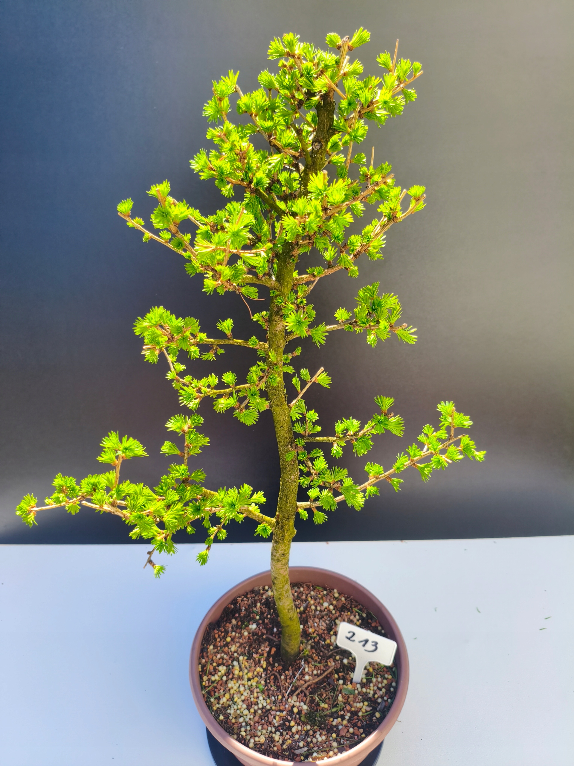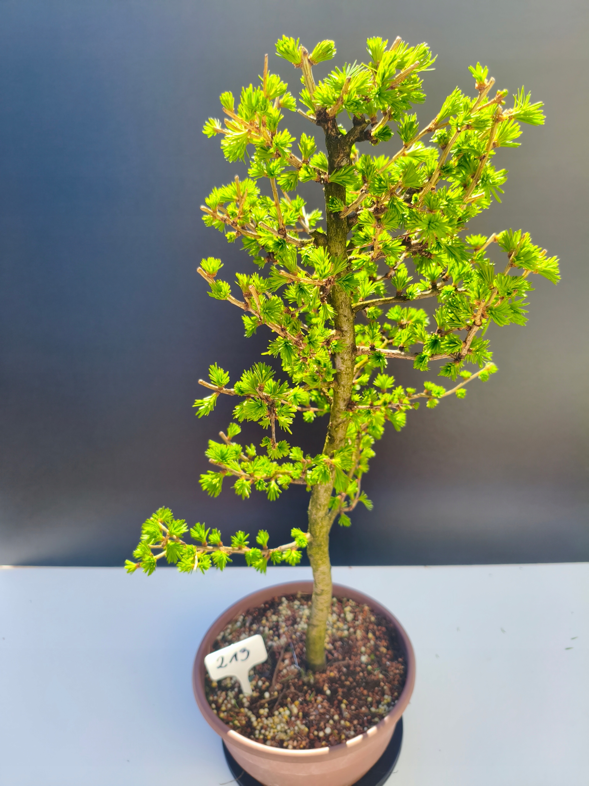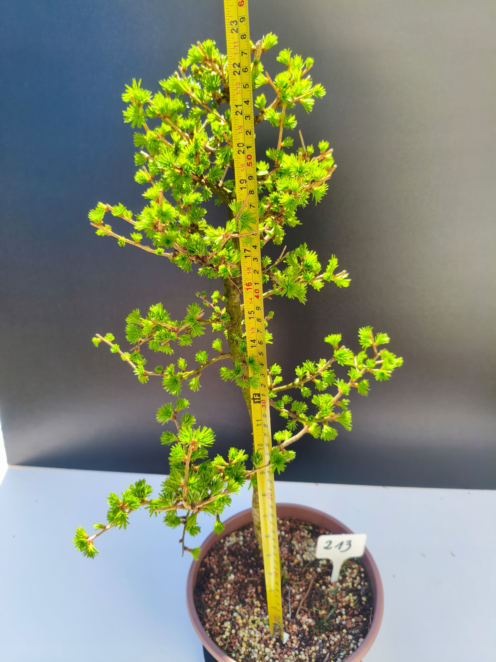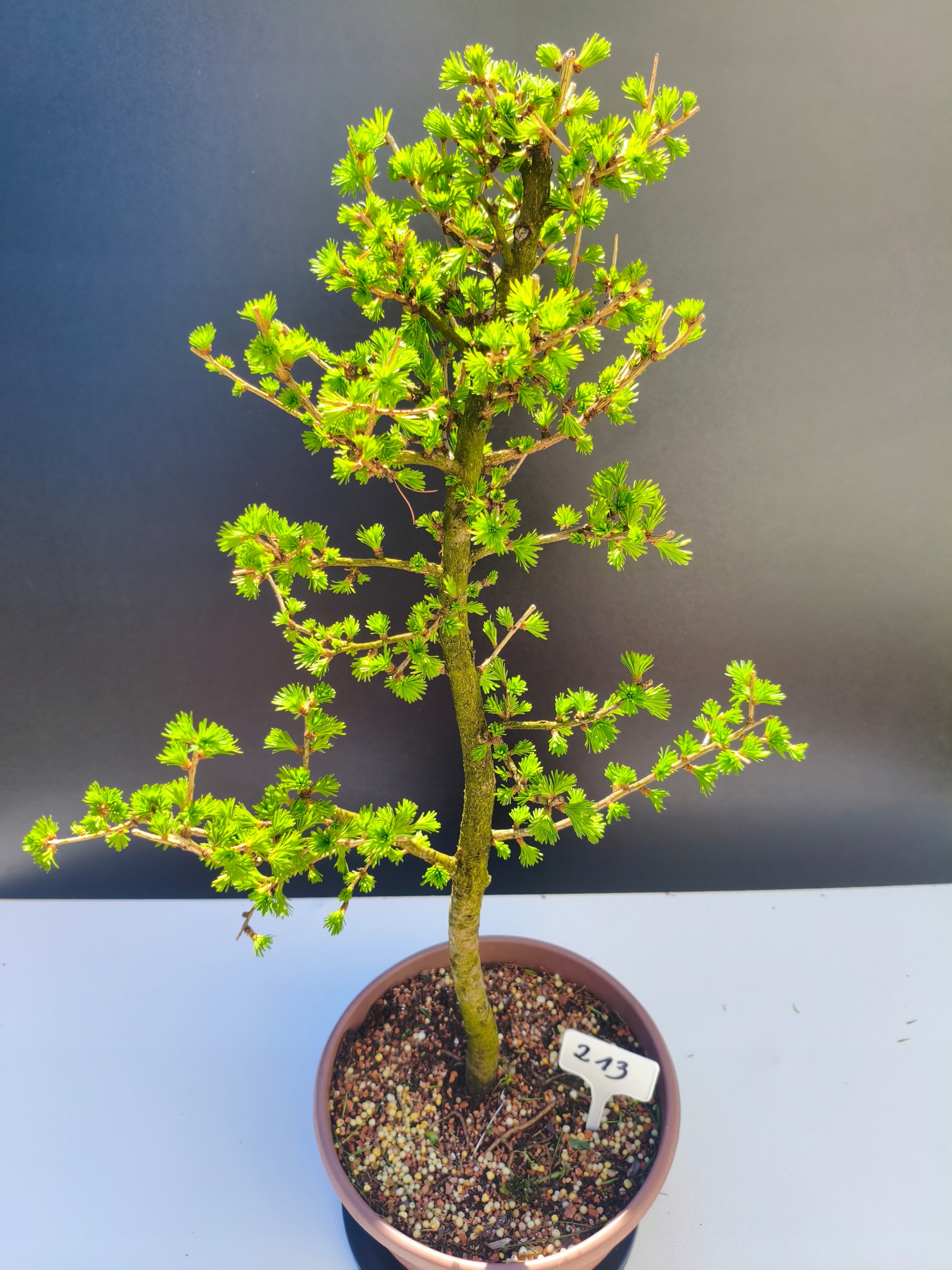 Każde nasze drzewko bonsai to unikalny egzemplarz, dlatego każde zostaje wystawione osobno, ponieważ traktujemy każde indywidualnie – od formowania po pielęgnację. Modrzewie te są w naszych rękach od 2021 roku i obecnie mają już 11 lat, dzięki czemu prezentują się wyjątkowo dojrzale i stabilnie.