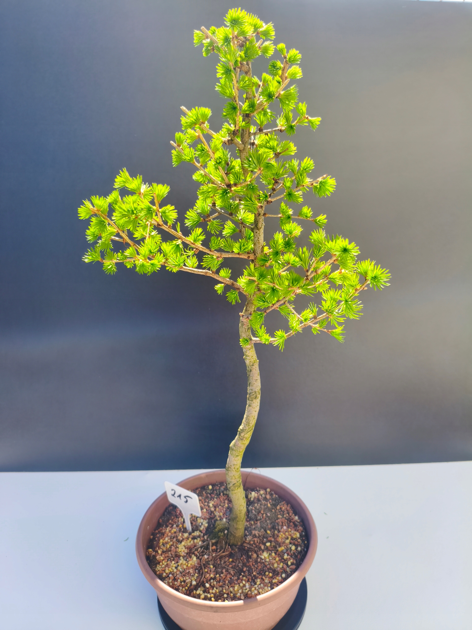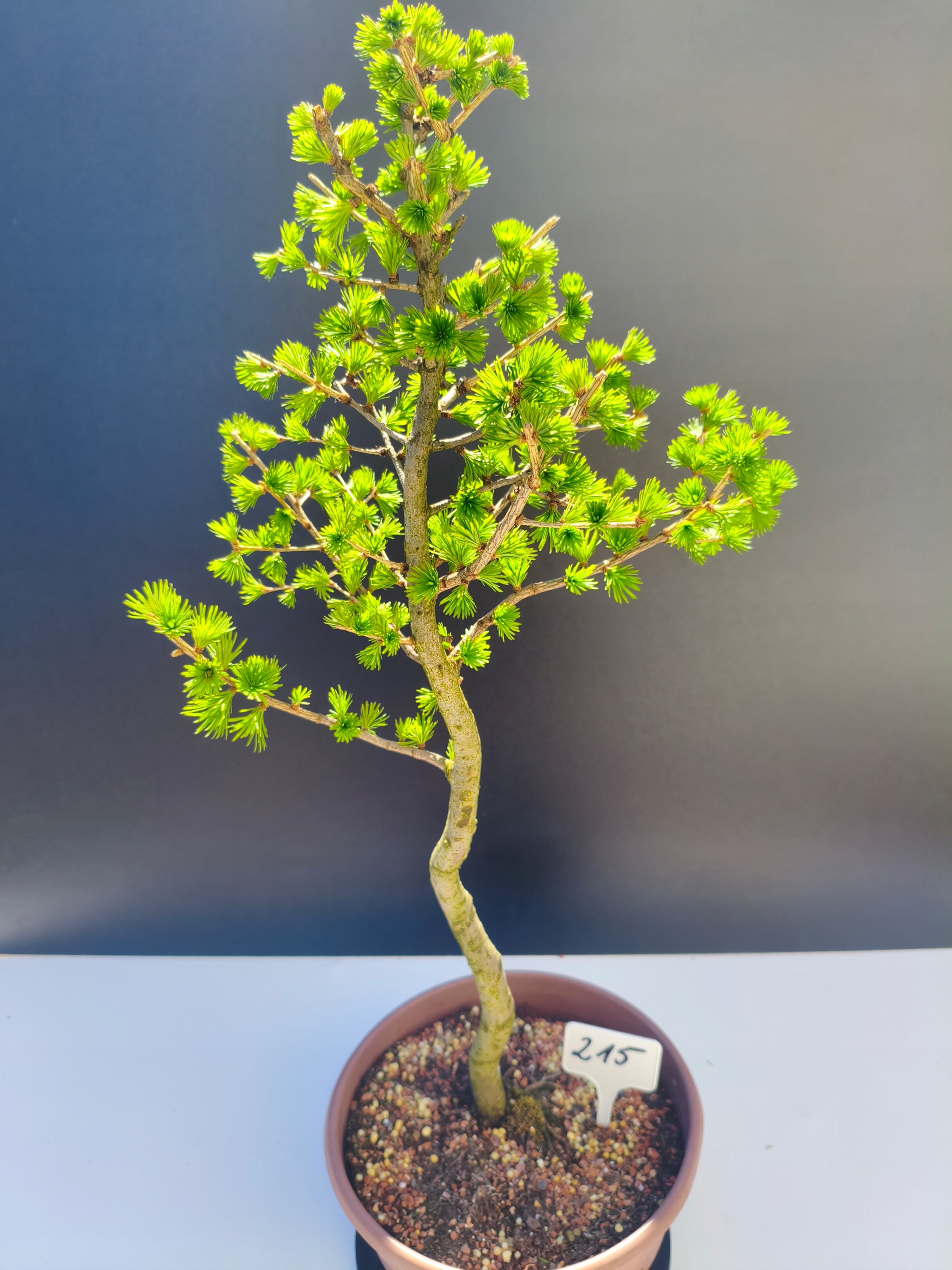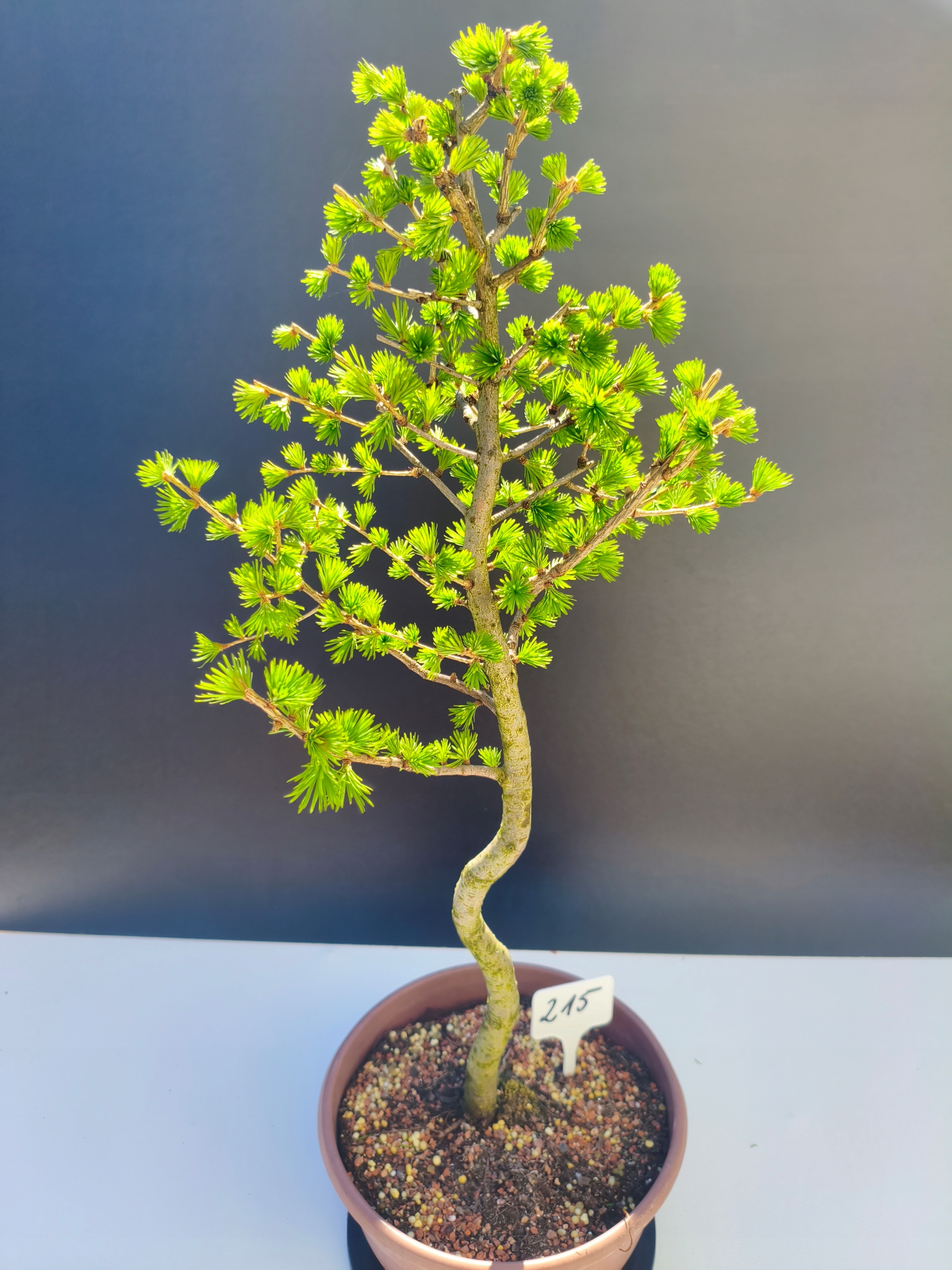 Każde nasze drzewko bonsai to unikalny egzemplarz, dlatego każde zostaje wystawione osobno, ponieważ traktujemy każde indywidualnie – od formowania po pielęgnację. Modrzewie te są w naszych rękach od 2021 roku i obecnie mają już 11 lat, dzięki czemu prezentują się wyjątkowo dojrzale i stabilnie.