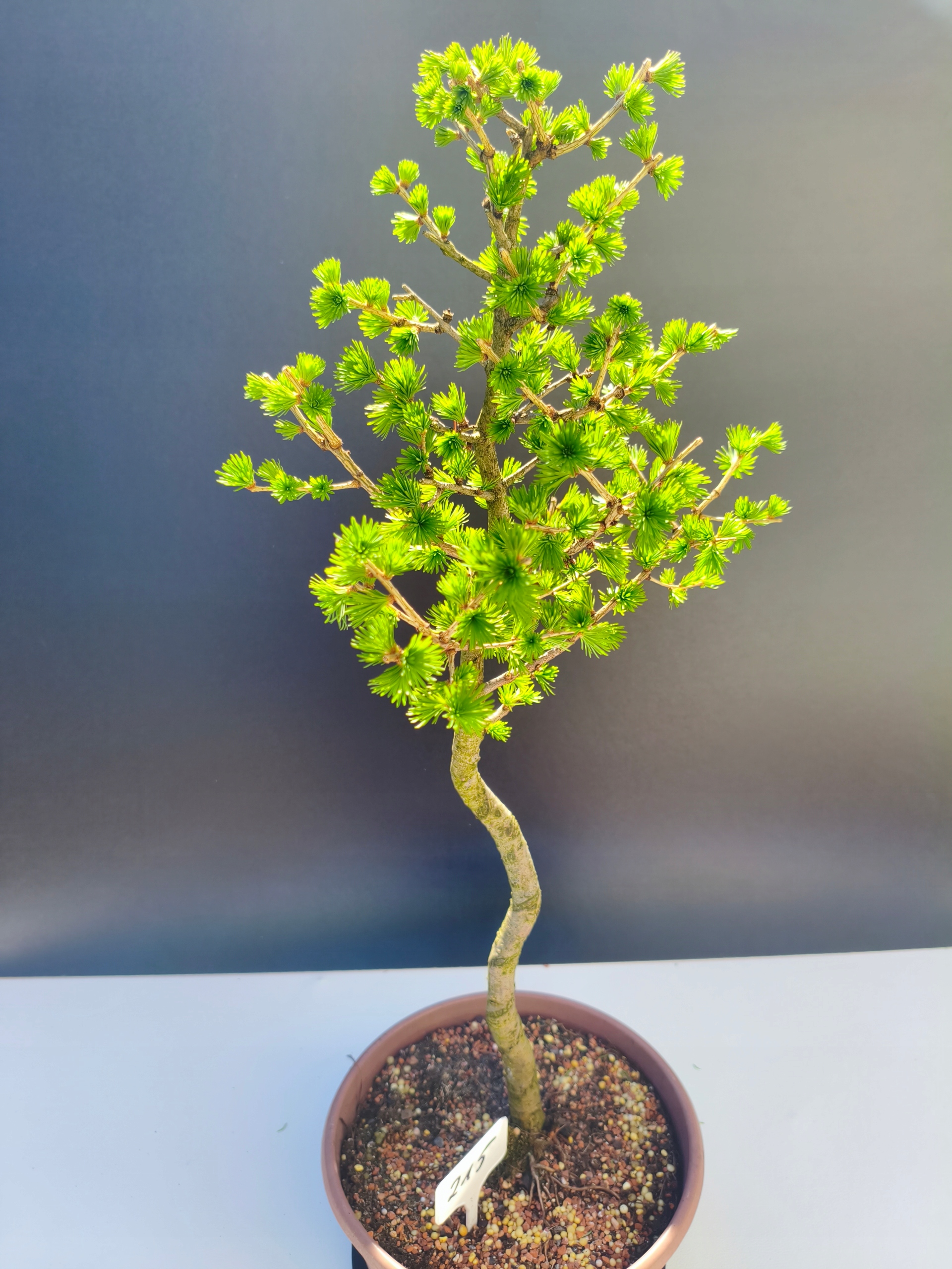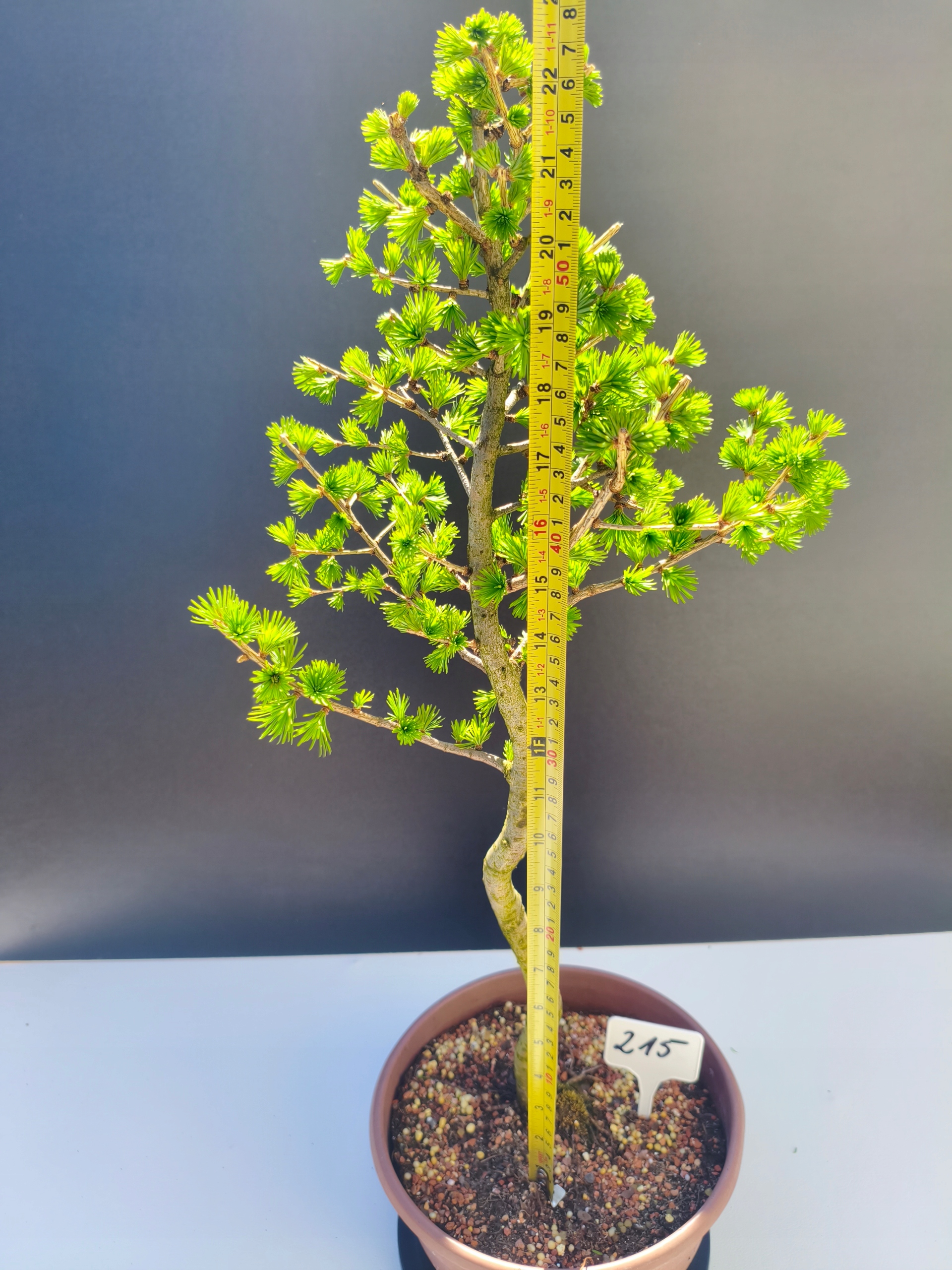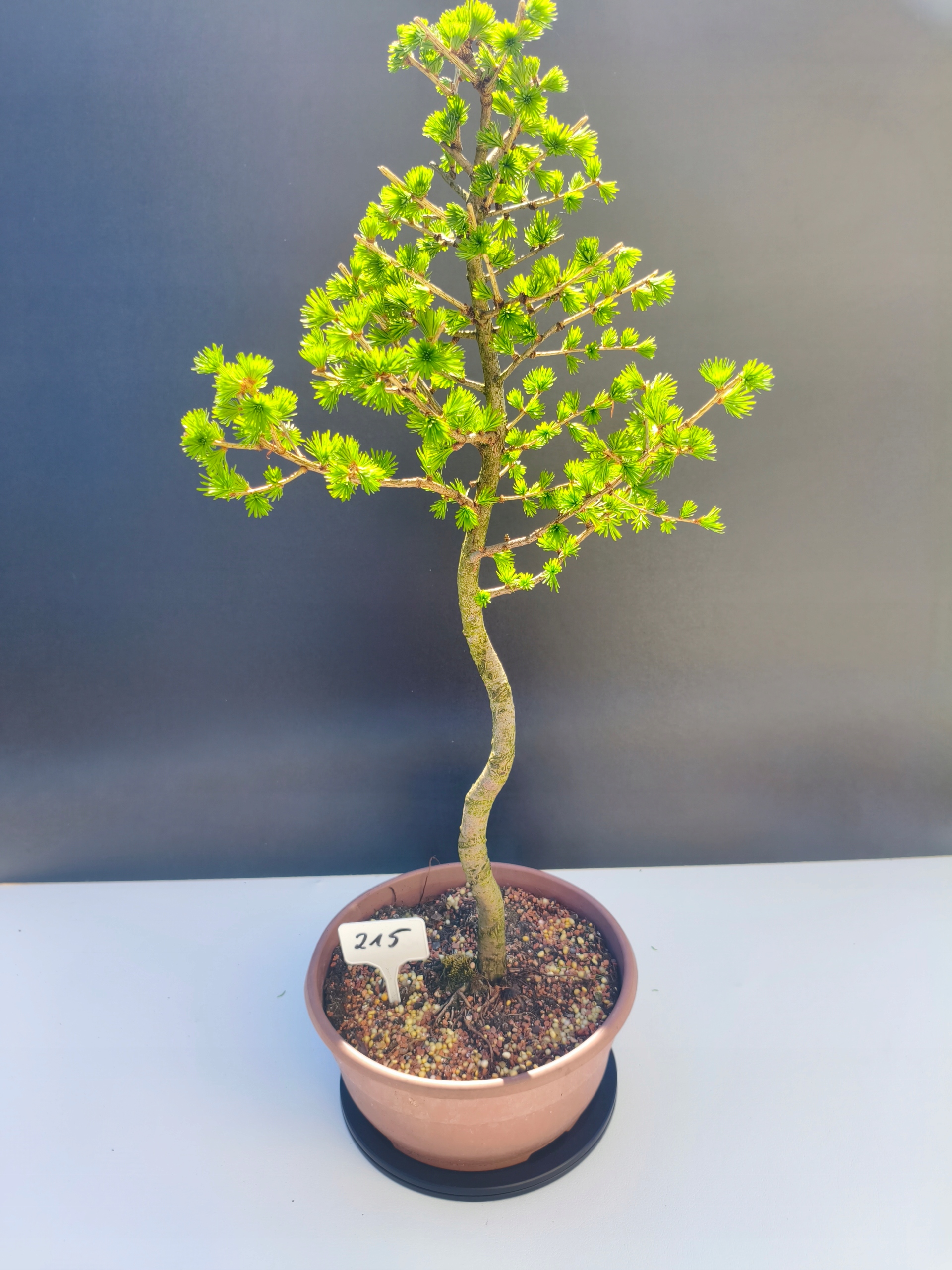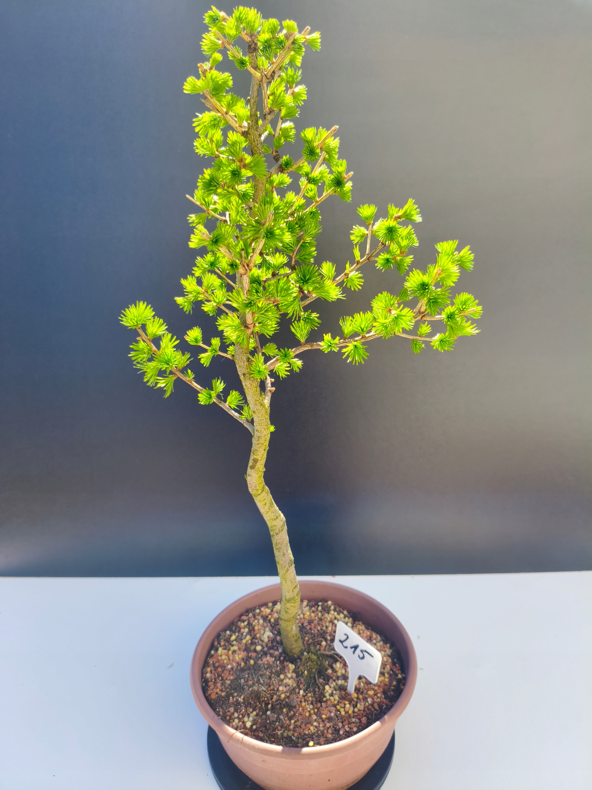 Każde nasze drzewko bonsai to unikalny egzemplarz, dlatego każde zostaje wystawione osobno, ponieważ traktujemy każde indywidualnie – od formowania po pielęgnację. Modrzewie te są w naszych rękach od 2021 roku i obecnie mają już 11 lat, dzięki czemu prezentują się wyjątkowo dojrzale i stabilnie.
